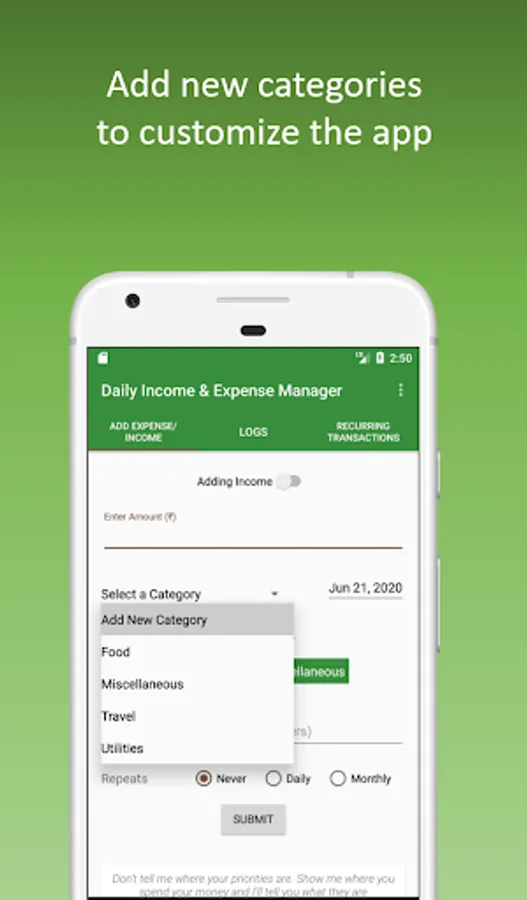 2. Option to add new categories (for both expenses and income)