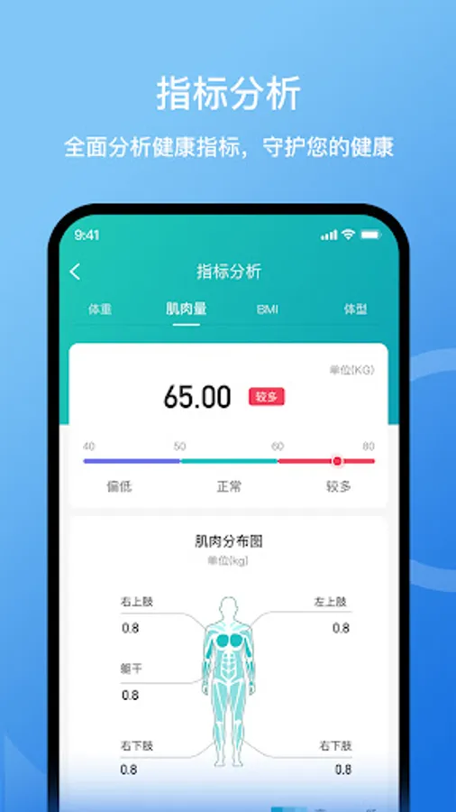 1. Use BIA technology to measure body impedance, and calculate a total of nearly 20 pieces of body data, so that you can understand yourself better.