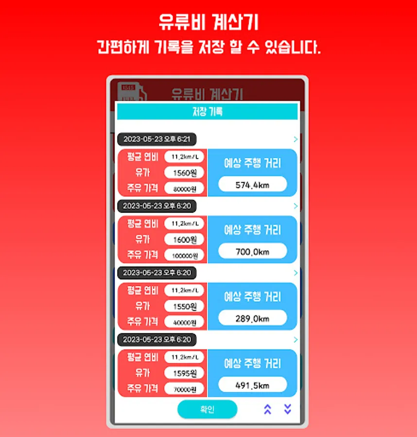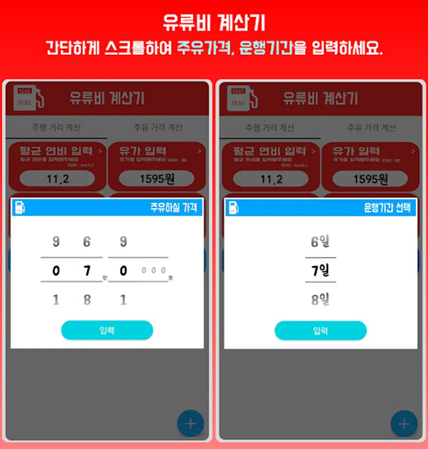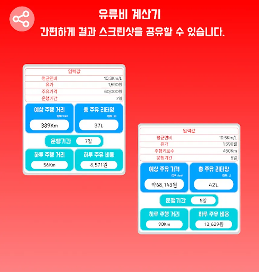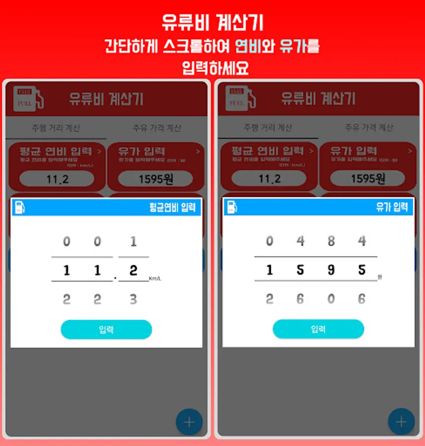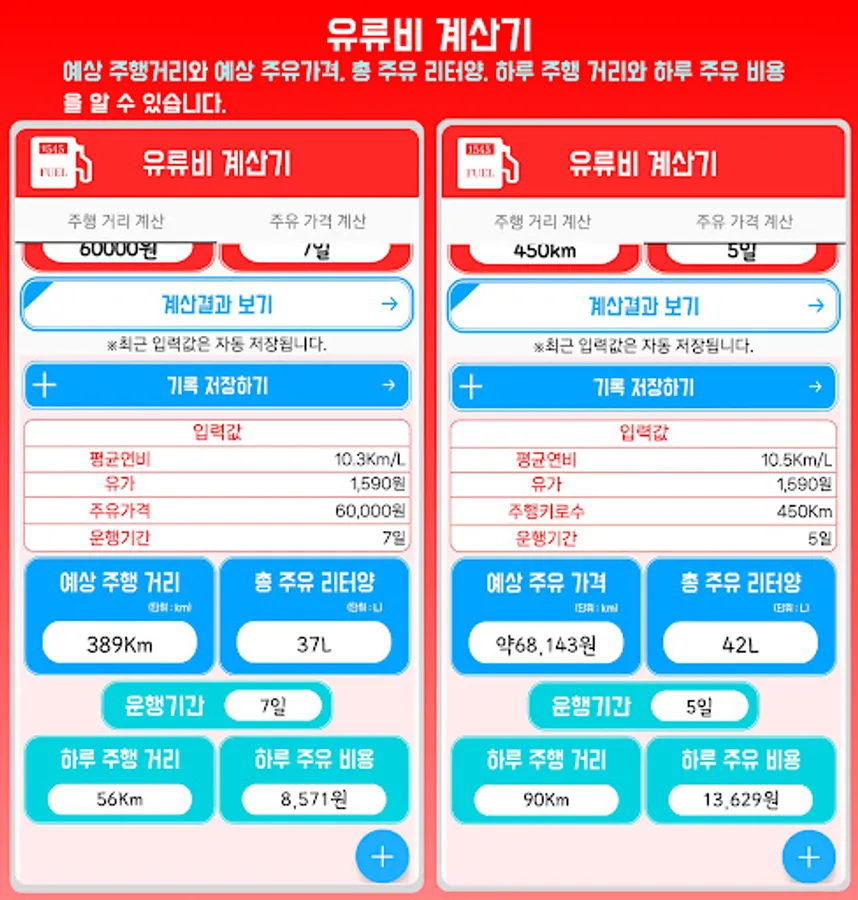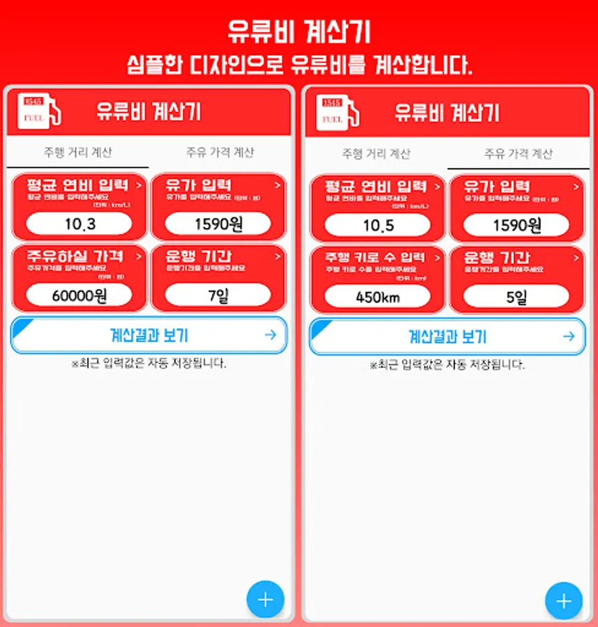 1. It is an app that can quickly calculate the mileage and gas price by simply entering the average fuel economy, oil price, price to be refueled, and the number with the driving key.