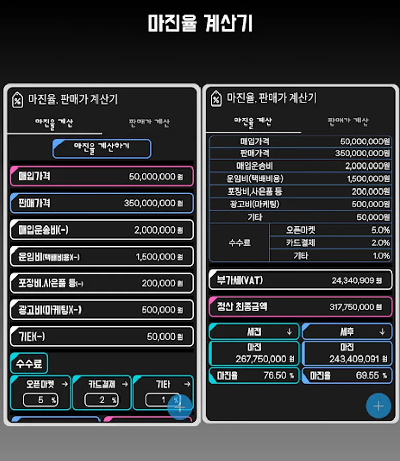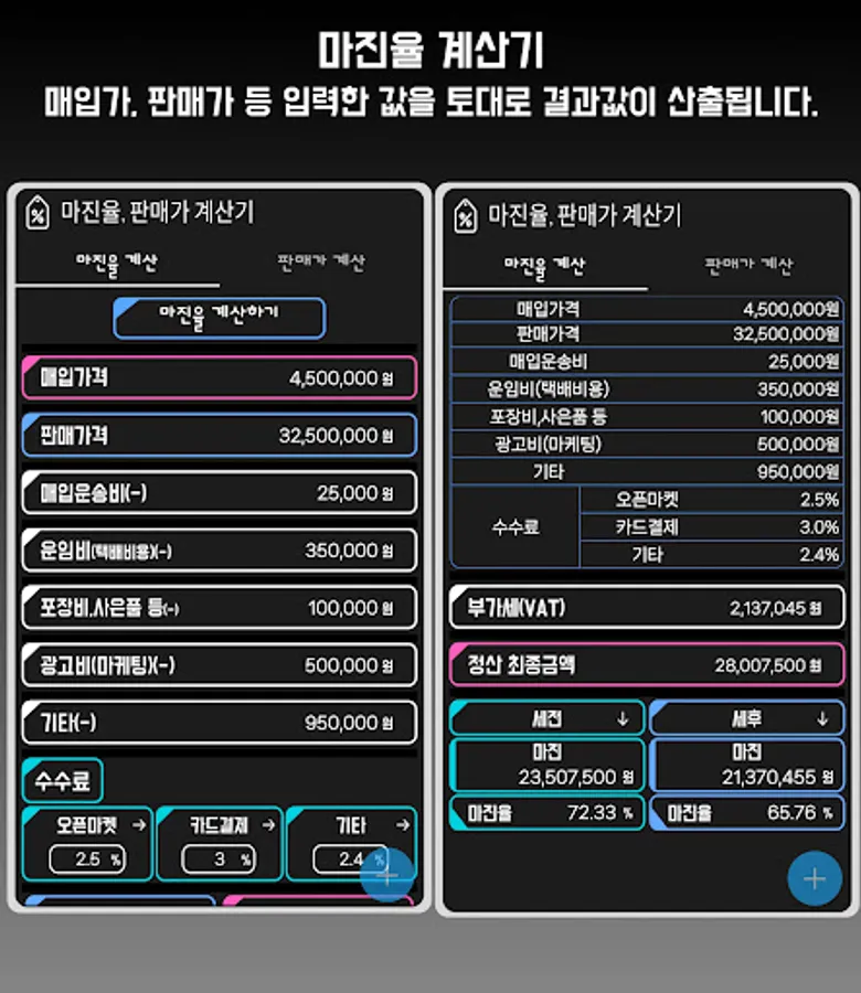 3. Click the Calculation Result button to view VAT and settlement amount, pre-tax margin and margin rate, and post-tax margin.