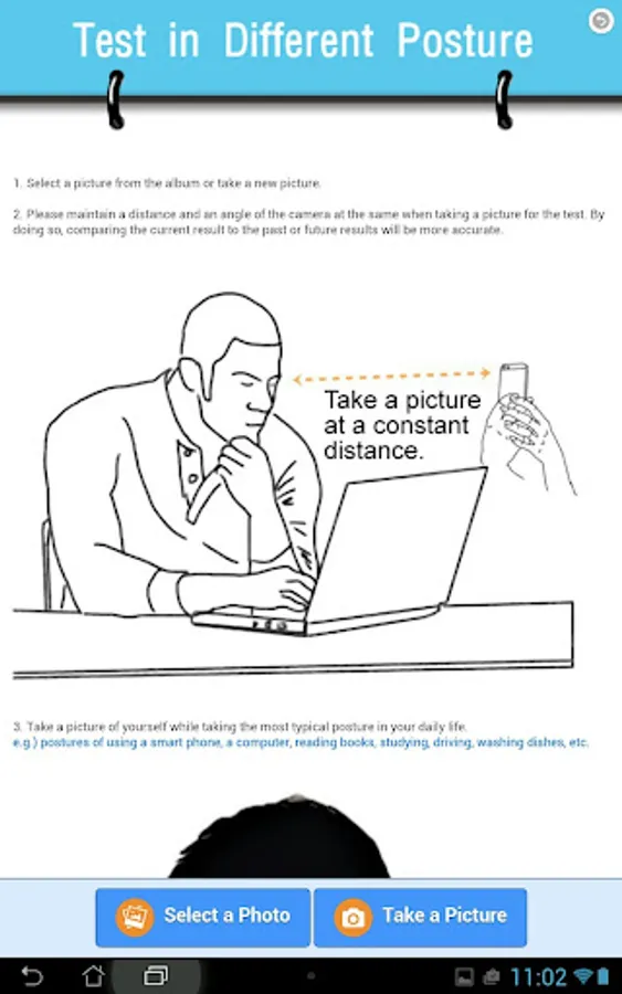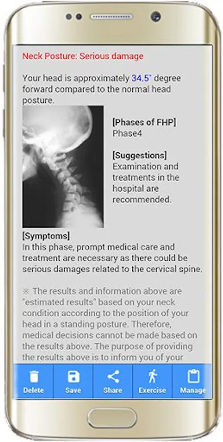 This application ① helps you check your neck posture by measuring the degree of your cervical spine based on the side view of your upper body and ② provides corresponding exercises to improve your neck posture.
