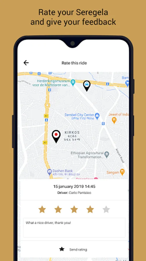 Order a Seregela with one touch of a button. The GPS in your smartphone instantly knows where you are, so ordering a Seregela is easy. You can set your pick up location with a single tap - or Google search for an address manually. By setting a drop-off point, you can also get a quote for the journey based on your pricing.