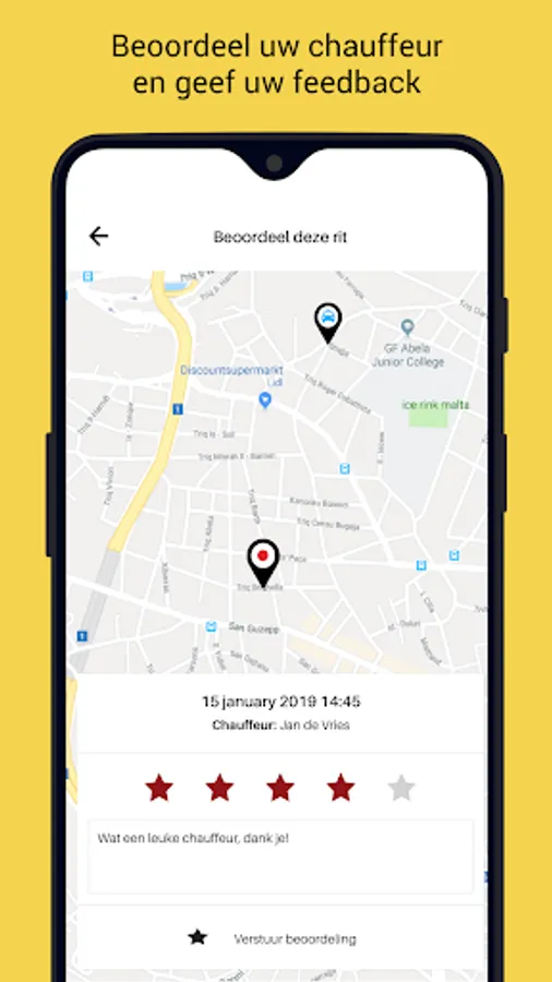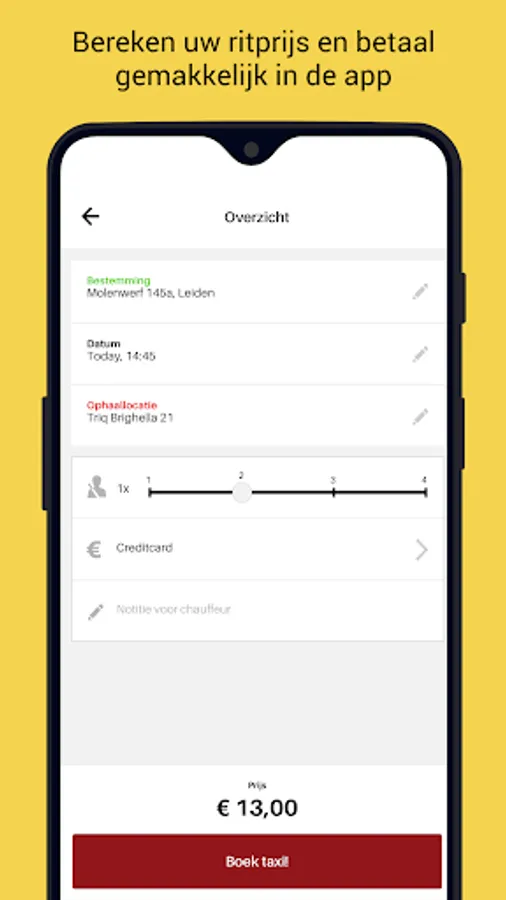 Wanneer je een bestemming invoert bij het bestellen van de taxi, berekent de app automatisch de ritprijs. De volledige rit historie is terug te vinden in de app.
