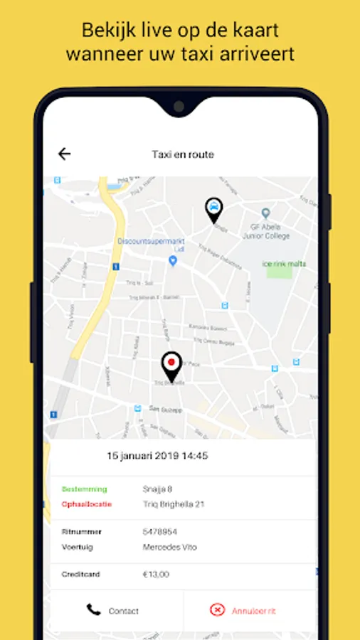- Volg de taxi op de kaart voor precieze aankomsttijd