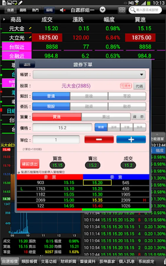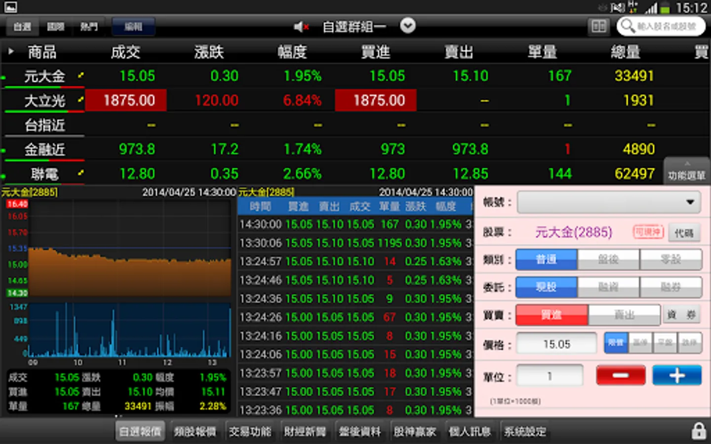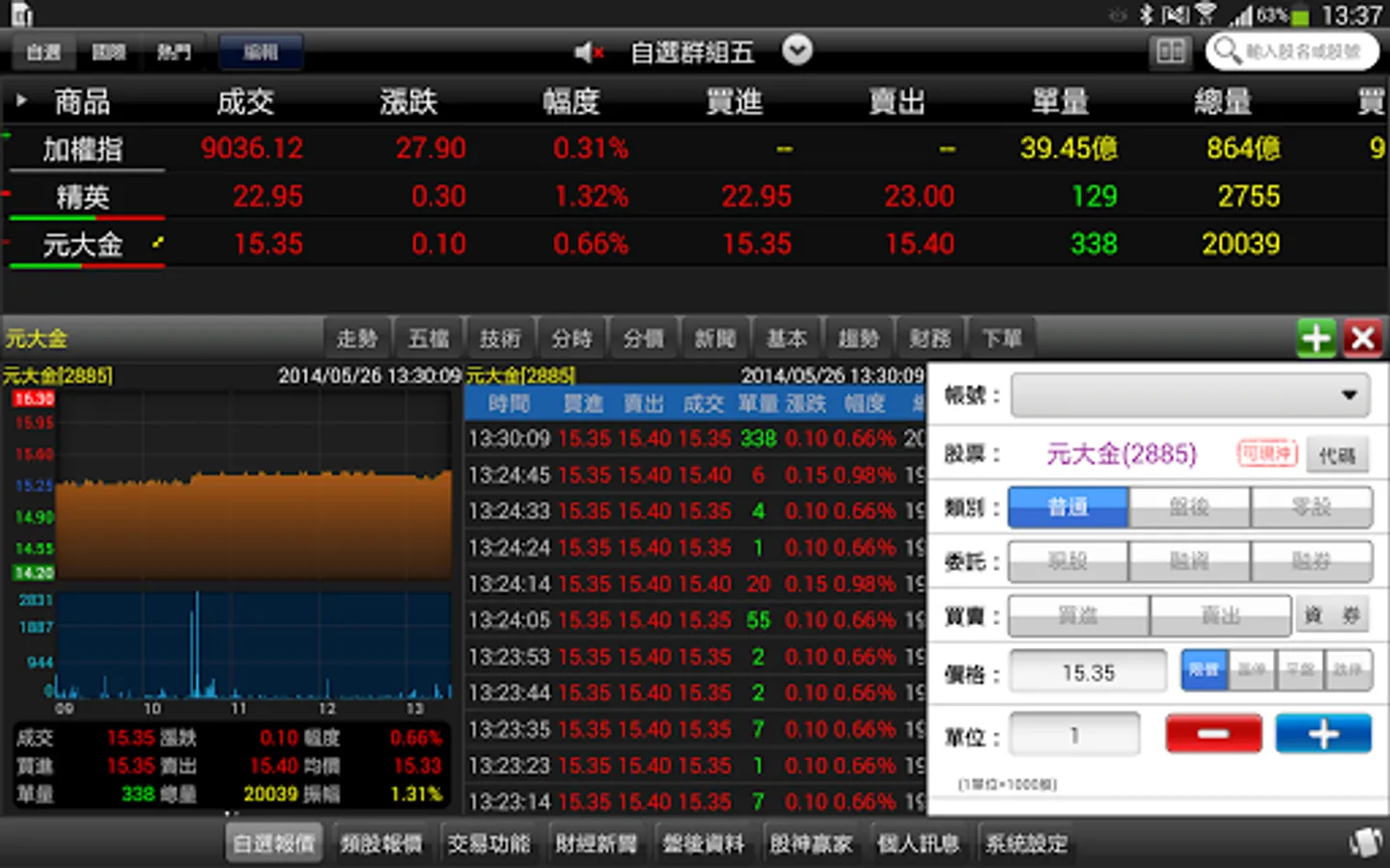 - Sources of information for this service (including but not limited to) Taiwan Stock Exchange, Taiwan Futures Exchange, and OTC trading centers. The content of this service is only to provide information services, and does not assume any responsibility for the correctness and applicability of all information transmitted through this service, and does not guarantee the accuracy of all information, and any loss caused by any inaccuracy or omission Not responsible for any compensation.