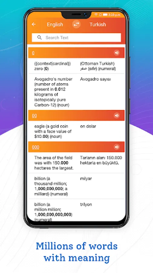 A lightweight android dictionary application works offline and gives faster results without any hassle. This free Turkish English Dictionary app is very helpful for pronunciation and spelling learning tool and it also has one powerful dictionary to translate sentences from Turkish to English and English to Turkish.