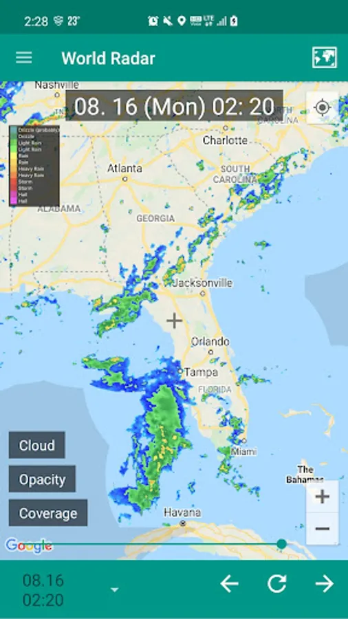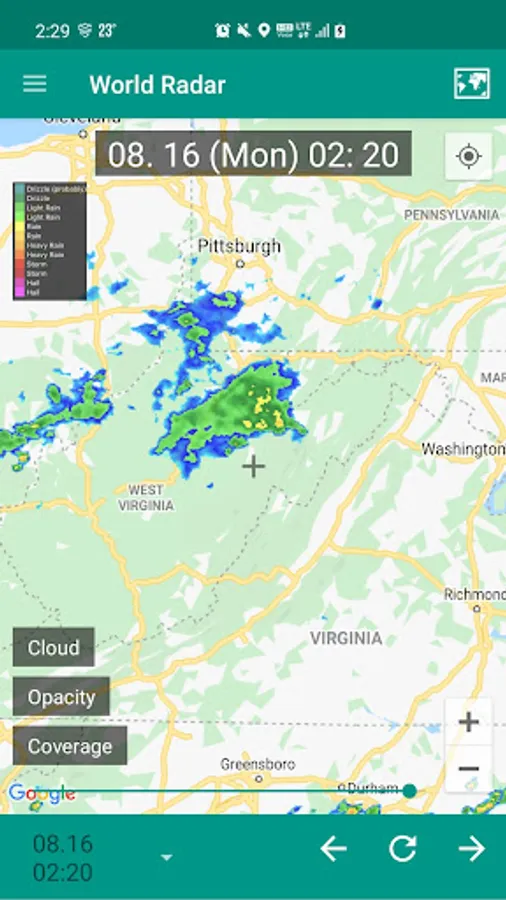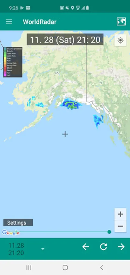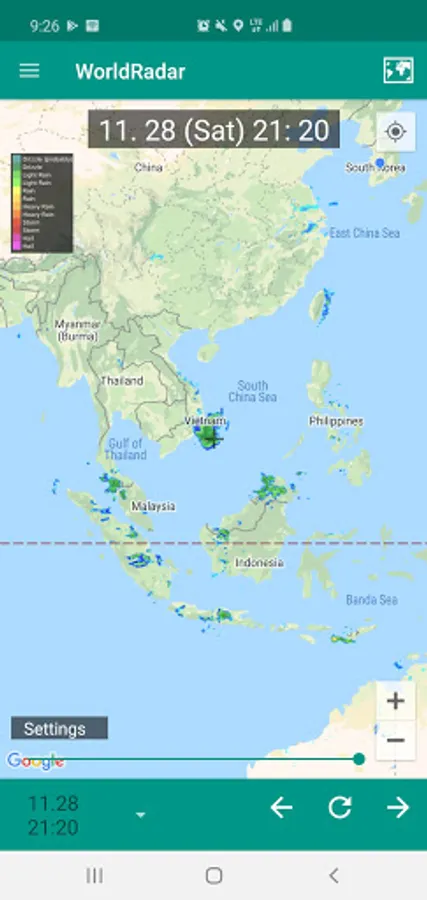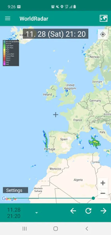 World Rain Radar uses multiple sources of data, not one map for the whole world. This gives you the most recent data for your location. Therefore, World Rain Radar works best when zooming in to your local area.