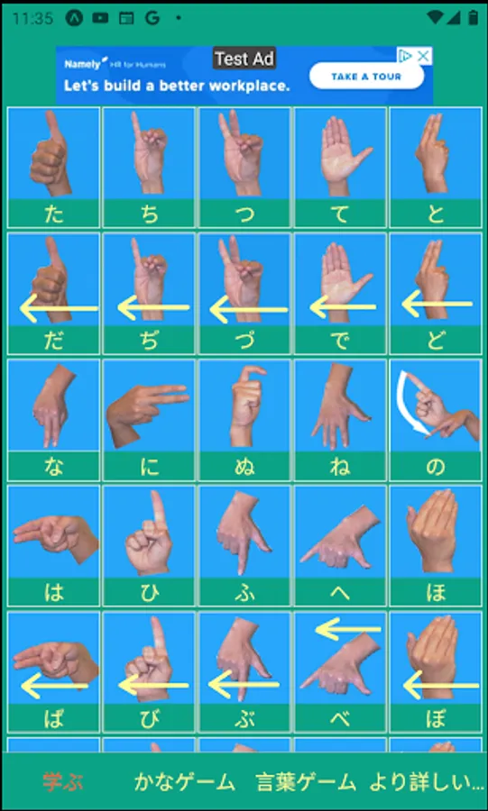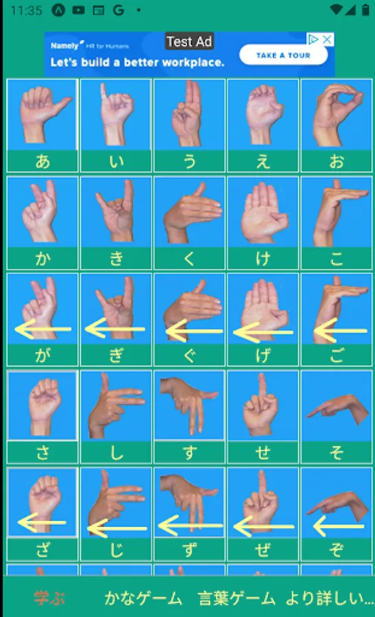This app can be used to learn finger spelling, which is a system for hand-expressing katakana in Japanese sign language.