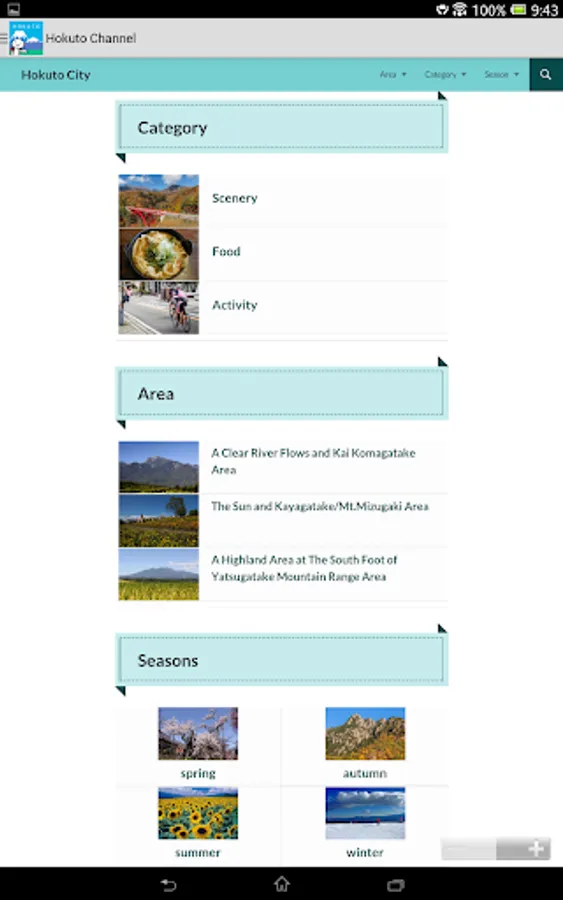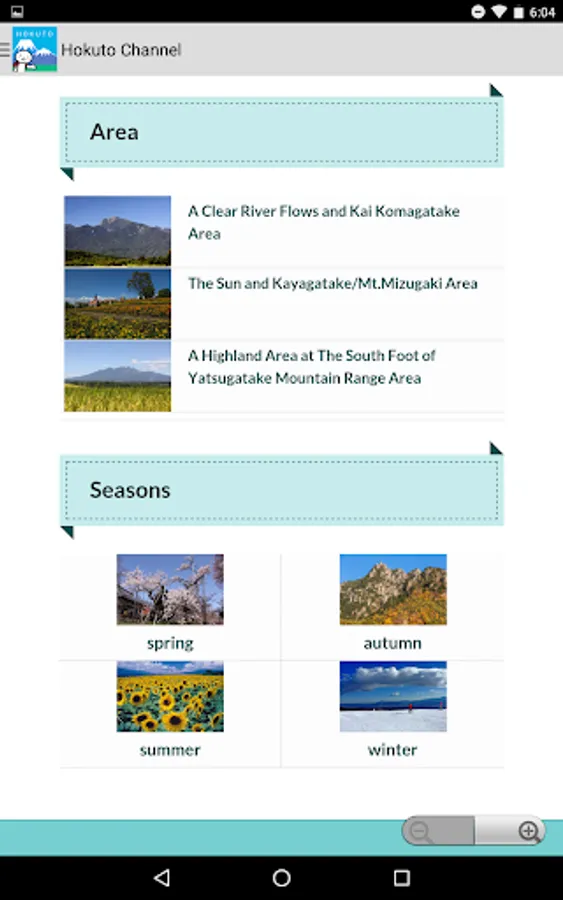 A guide app for foreign visitors to Hokuto City, Yamanashi Prefecture. The easy-to-use interface lets you search for sightseeing spots by area or season, so you can experience the boundless nature, delicious food, and many other charms of Hokuto City. Download the app and enjoy your trip to Hokuto City even more.