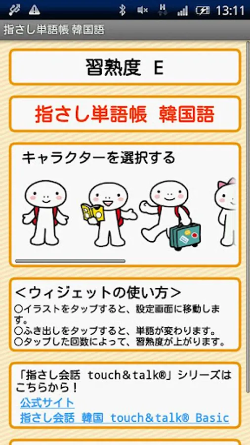 This widget is based on "YUBISASHI touch&talk®" which you can download it as a android application. You can choose your favorite widget from 7 patterns. Tap a vocab and the words come out at random. You can learn Korean wherever you want.