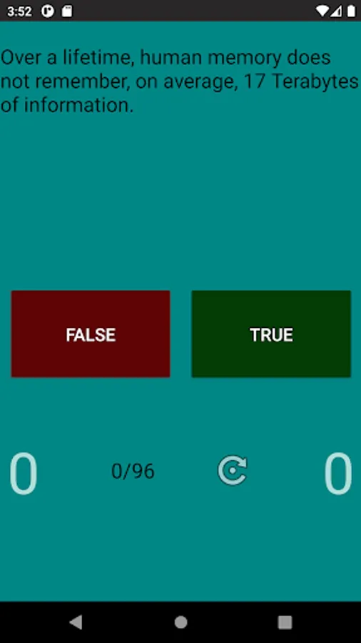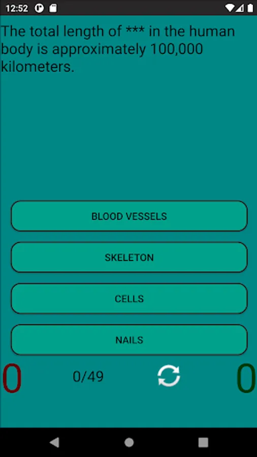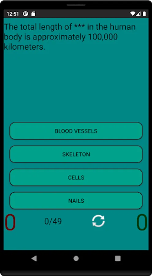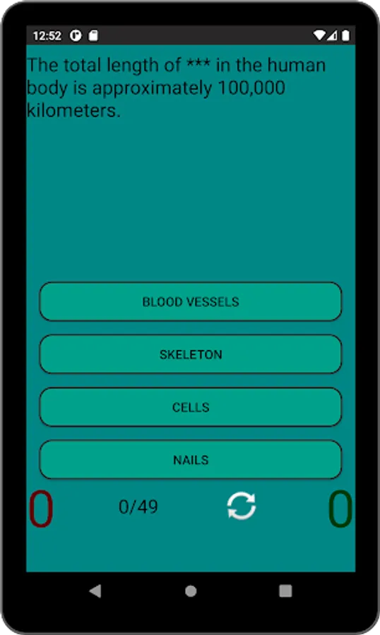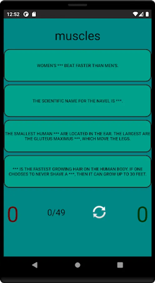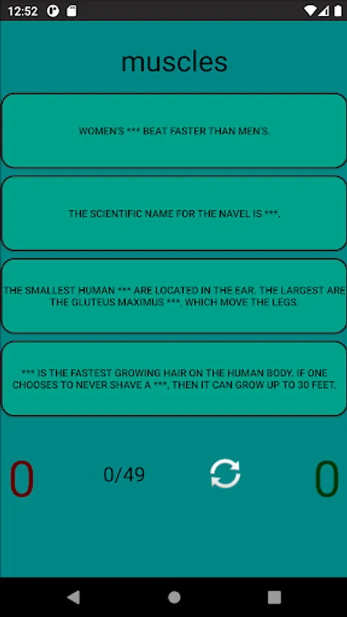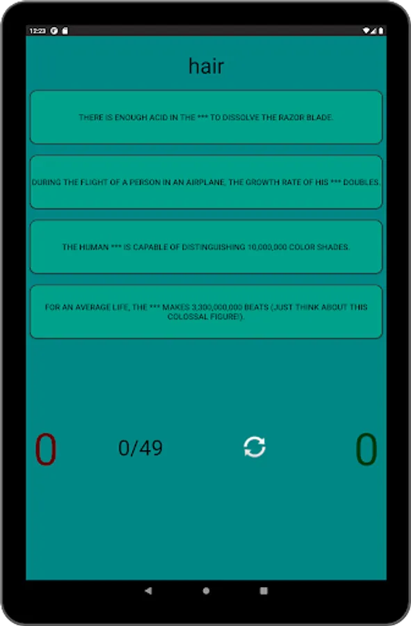 You can test your knowledge in 3 modes: match a body part to a phenomenon/fact/story, or match a phenomenon/fact/story in a mirror opposite to a body part, or match "true" or "false" in the script. In each of the 3 modes, you can start over, and at the end you will see the percentage of correct answers.