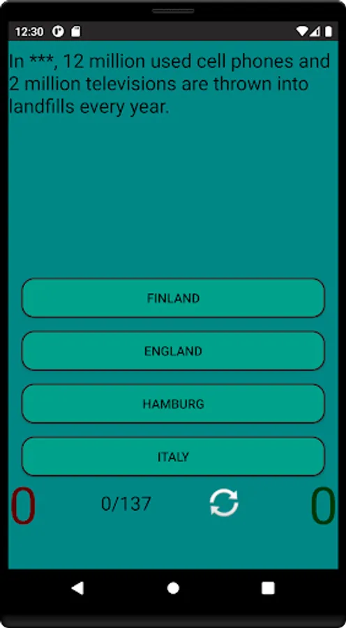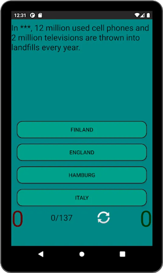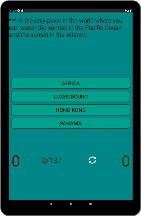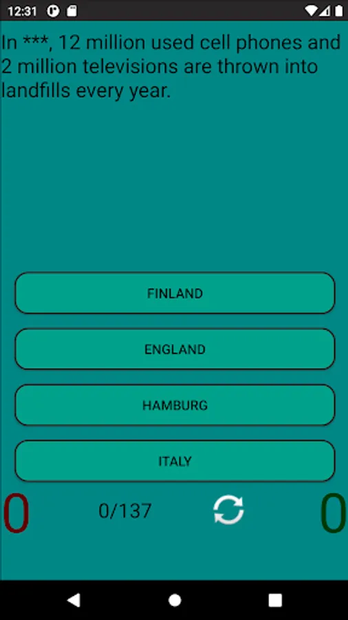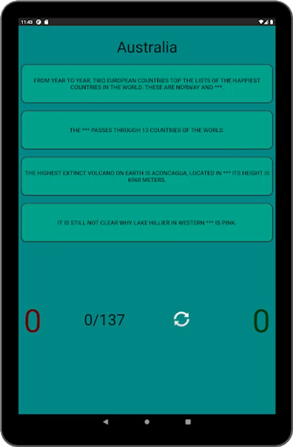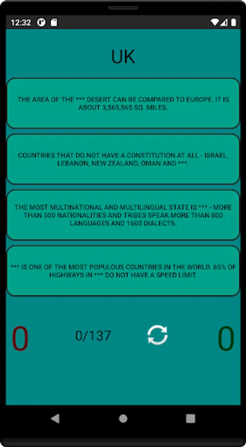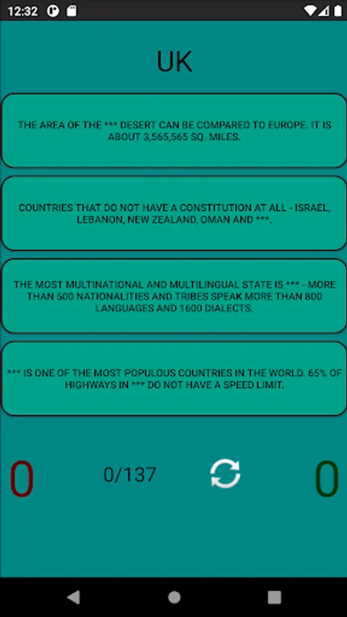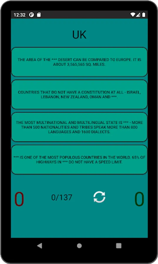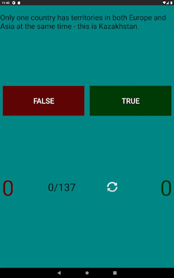 You can check your knowledge in 3 modes: select a geographical place for a phenomenon/fact/history, or select a phenomenon/fact/history in a mirror opposite to a geographical place, or answer "true" or "false" in the same mode. In each of the 3 modes, you can start over, and at the end you will see the percentage of correct answers.