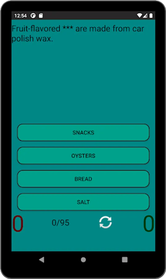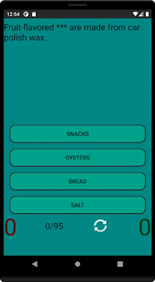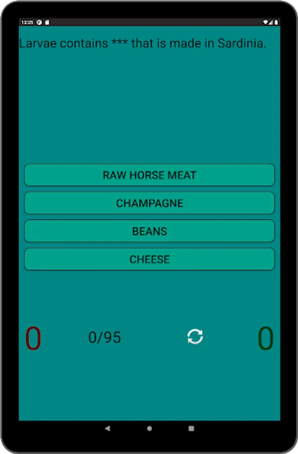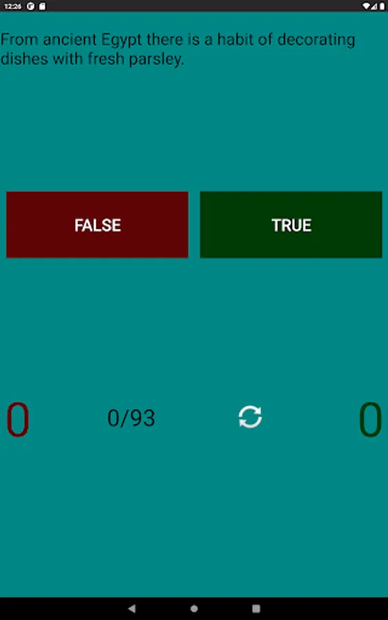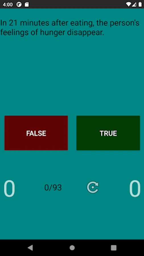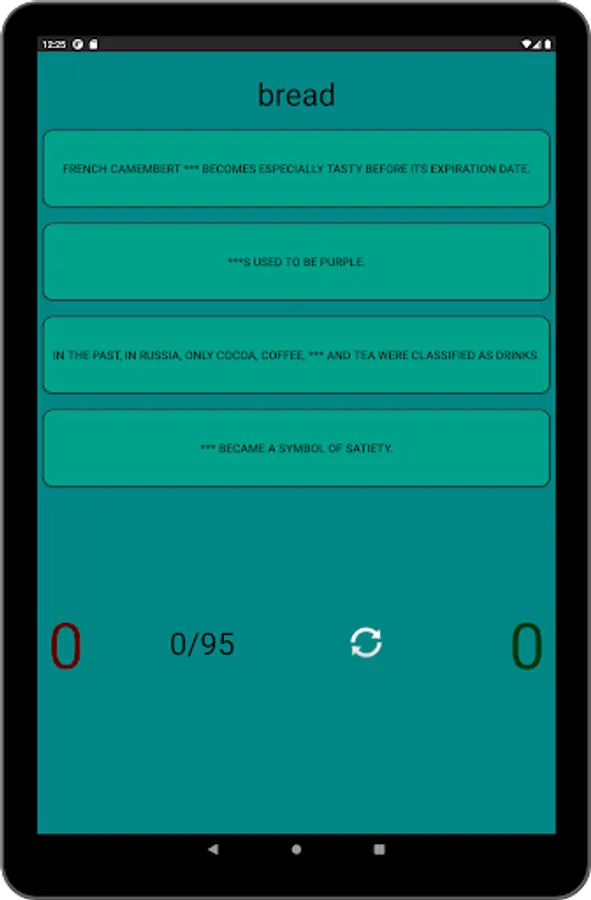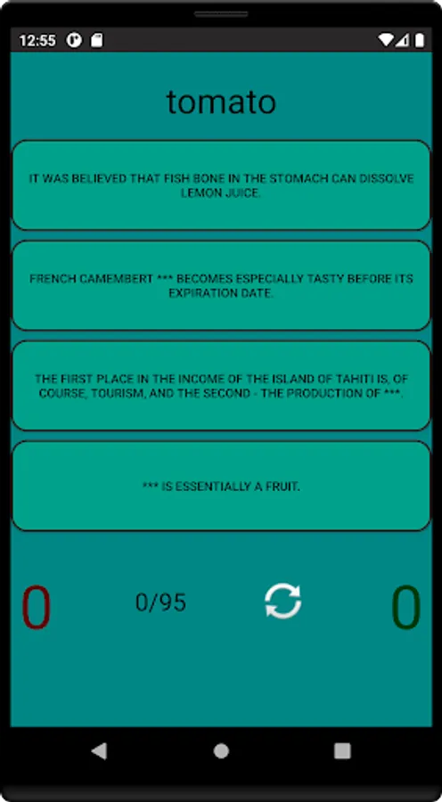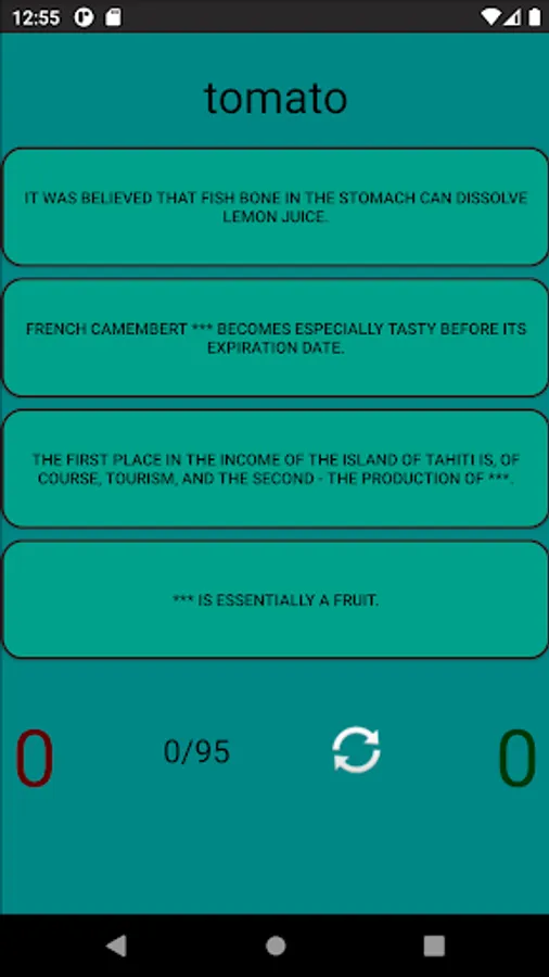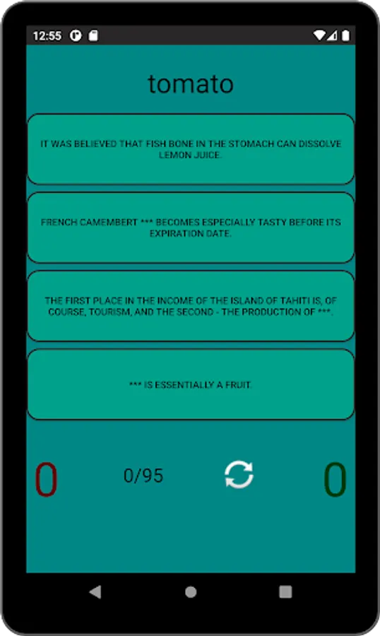 You can test your knowledge in 3 modes: match food to a phenomenon/fact/story, or pick up a phenomenon/fact/story in a mirror opposite to food, or answer "true" or "false" in the same mode. In each of the 3 modes, you can start over, and at the end you will see the percentage of correct answers.