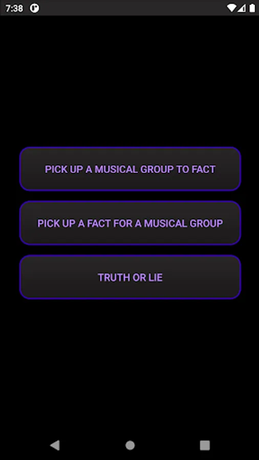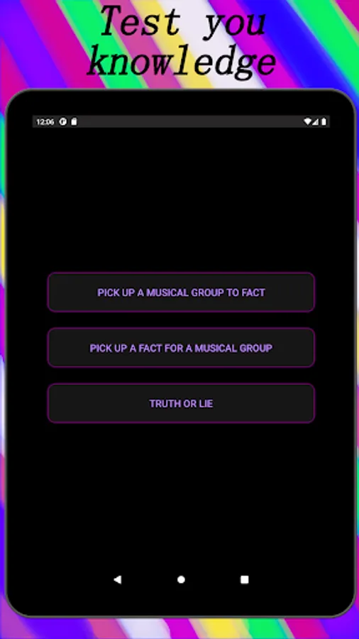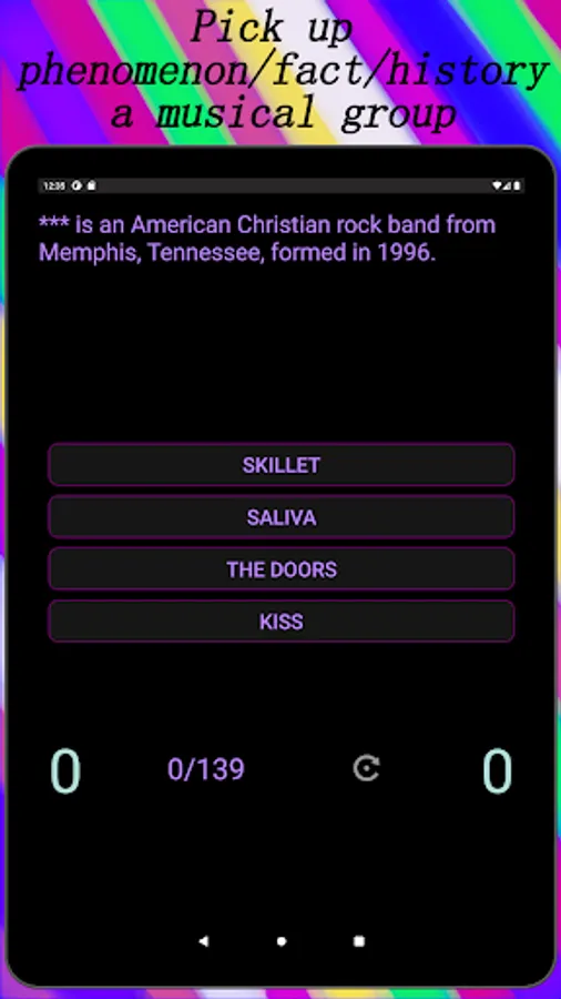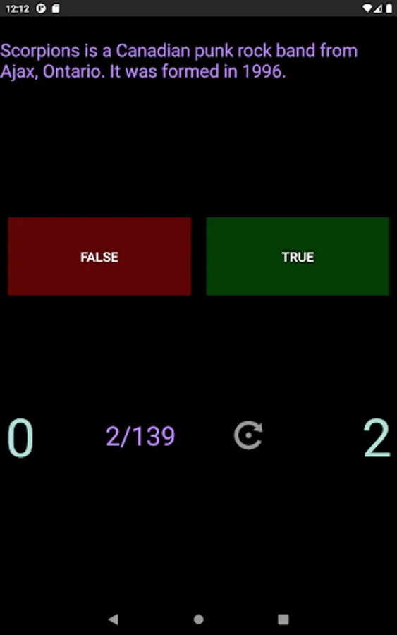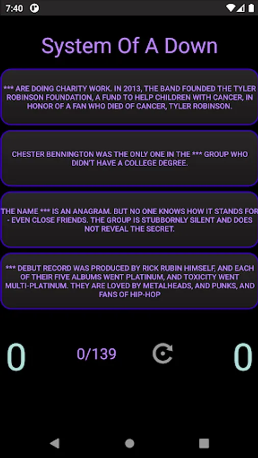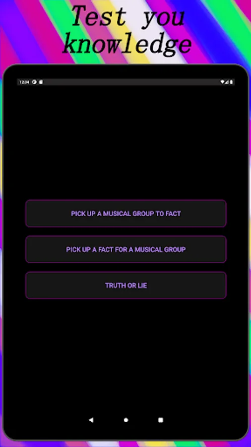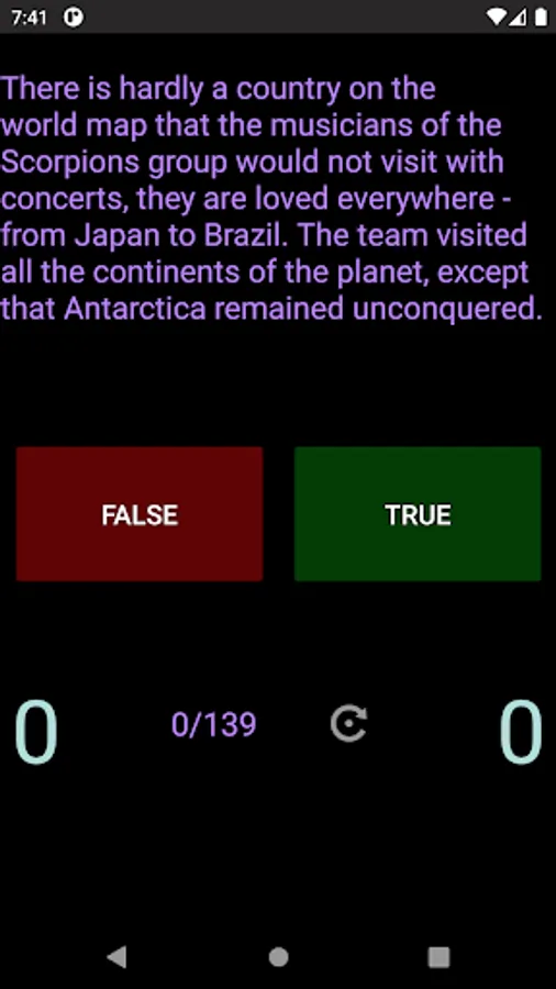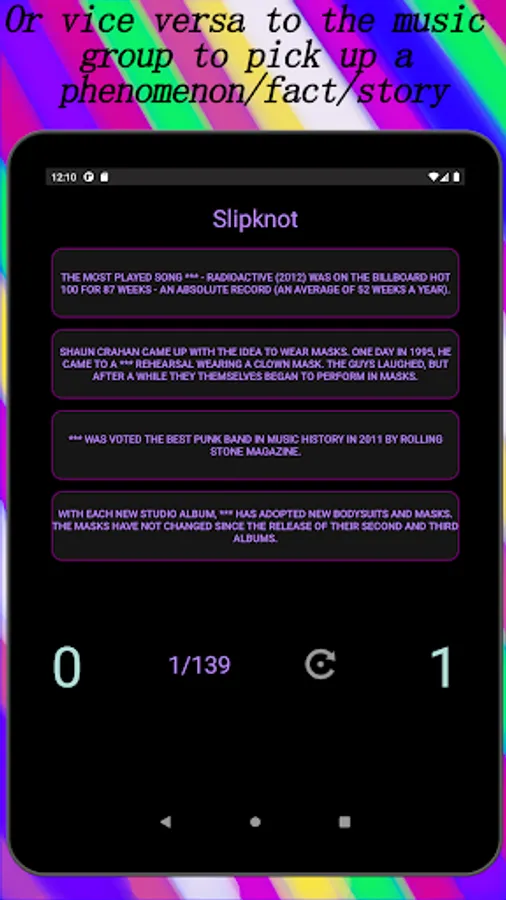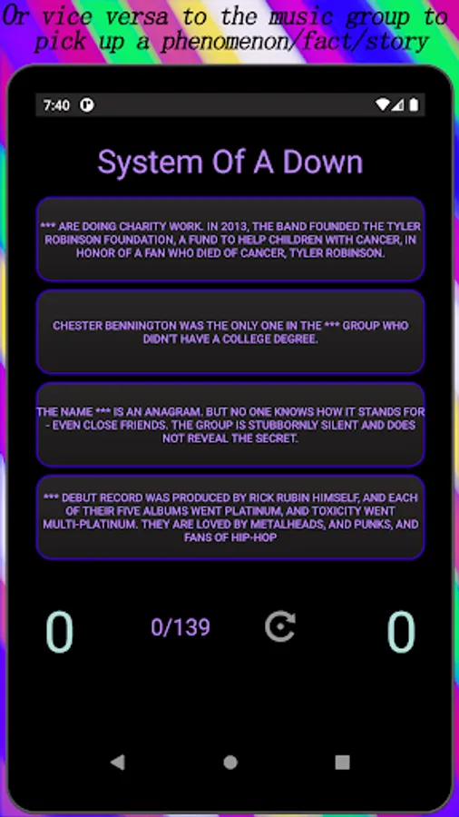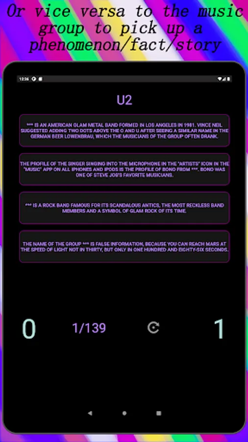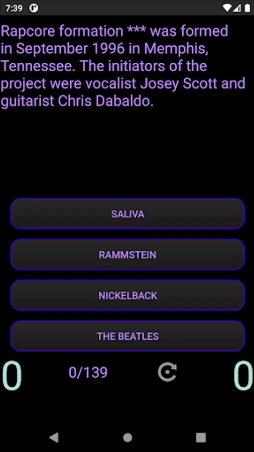 You can check your knowledge in 3 modes: choose a musical group for a phenomenon/fact/history, or vice versa to the music. group to choose a phenomenon / fact / story, or answer "true" or "false" in the same mode. In each of the 3 modes, you can start over, and at the end you will see the percentage of correct answers.