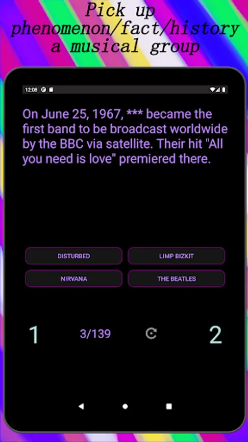 In fact, the app would be better called Music group phenomena or Brief stories about musical groups. At the moment, the application features 50 musical groups, mostly from the 20th century, including: The Beatles, Scorpions, AC/DC, Deep Purple, ZZ Top.