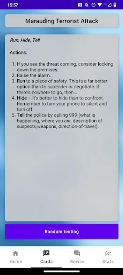 The Protect Duty app is a free library of action cards for countering terrorist threats on your venue. Each action card contains practical information your venue and security staff need safely resolve a terrorist attack.