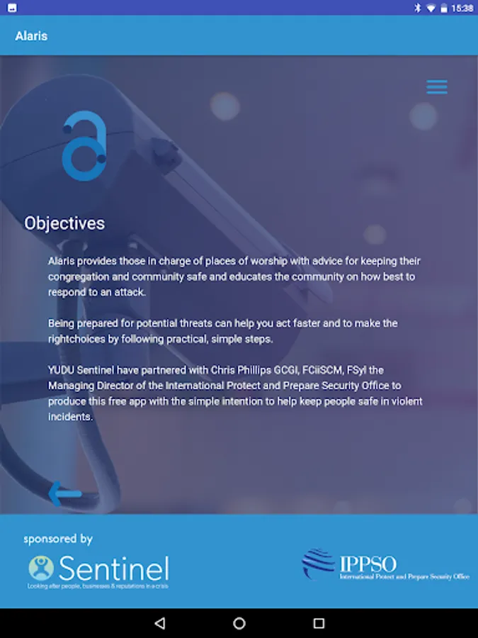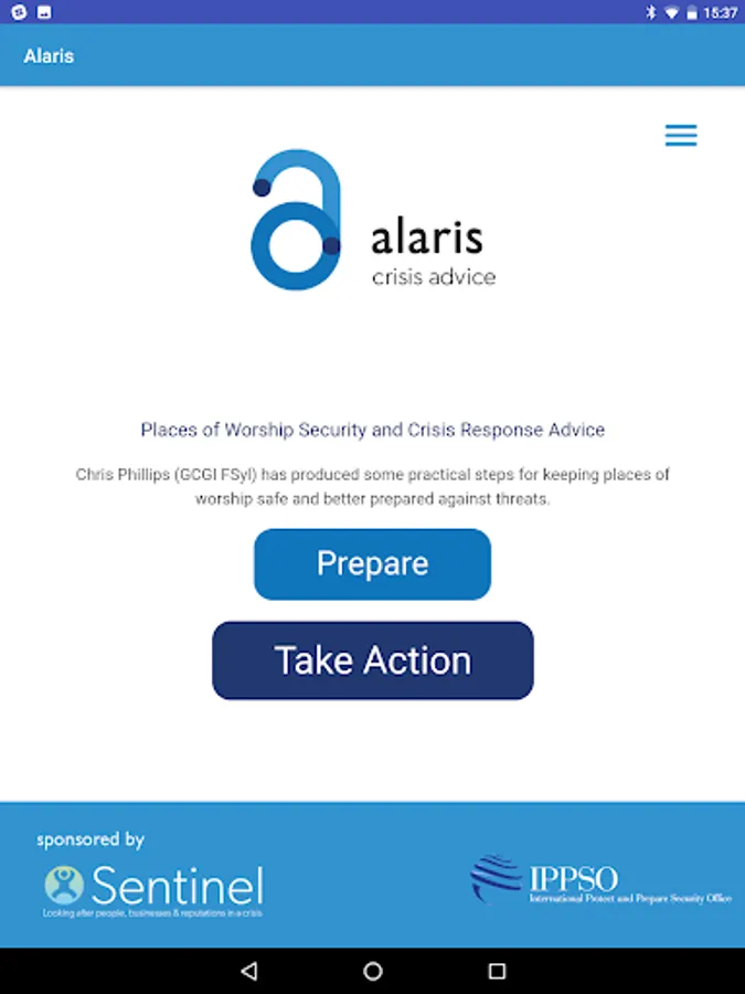 Alaris’s “Take Action” button in the app provides immediate practical steps for responding to the different threats. YUDU Sentinel have kept the design of the Alaris app simple for the benefit of people of all faiths across the world.