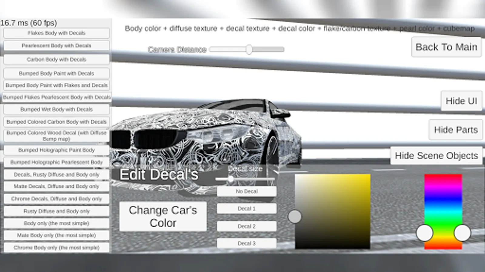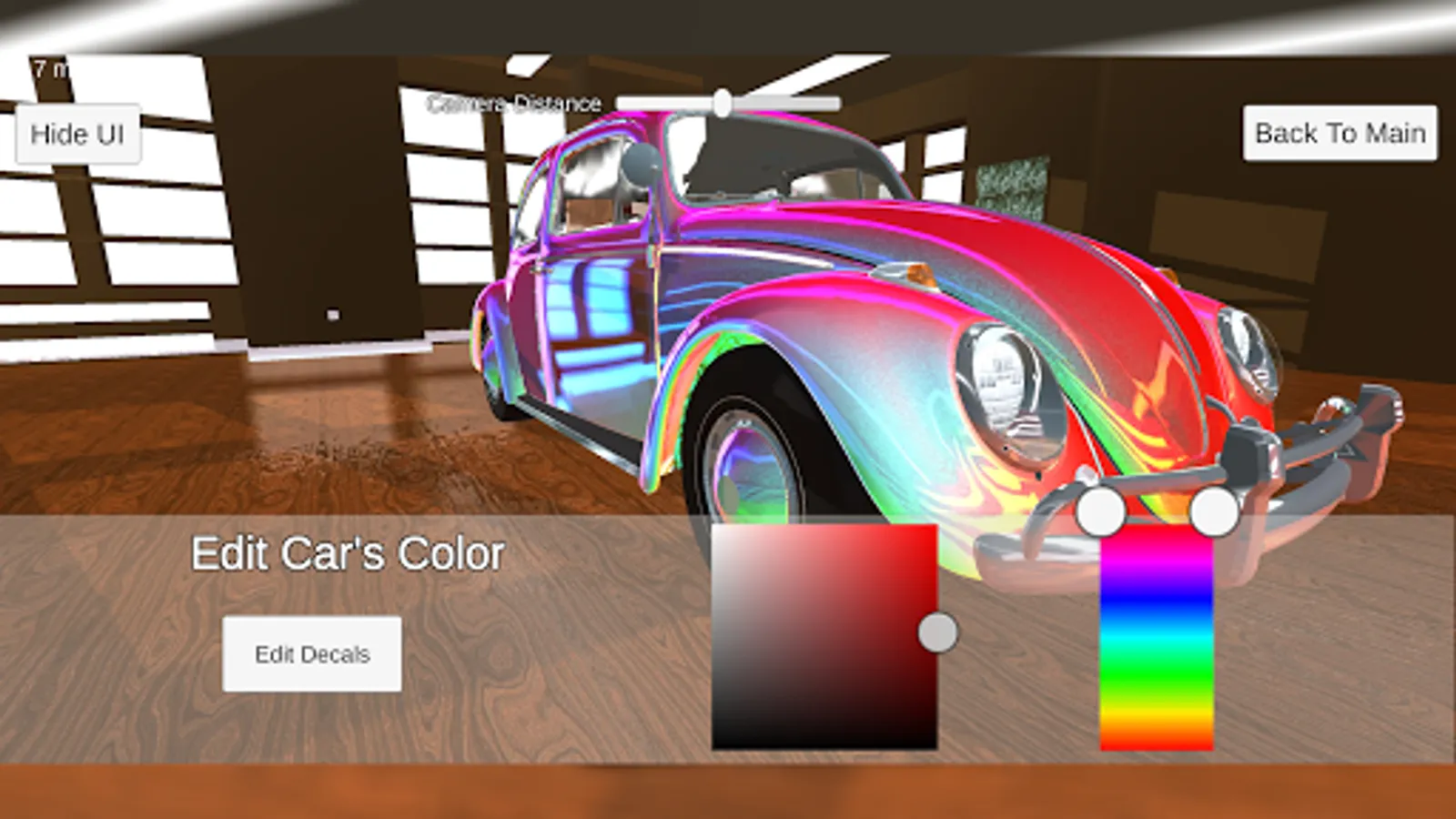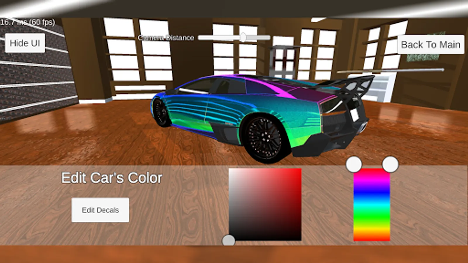 Some scenes have a color picker to change the car's color and add decals.