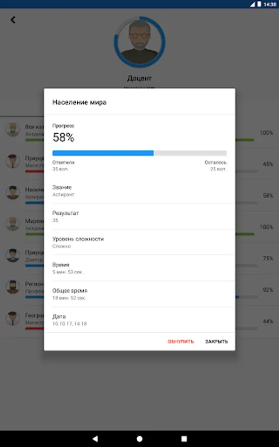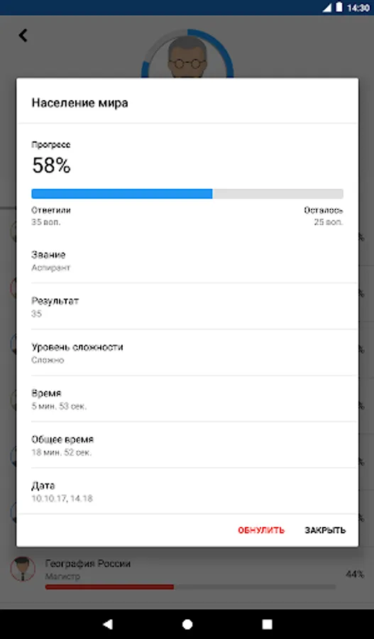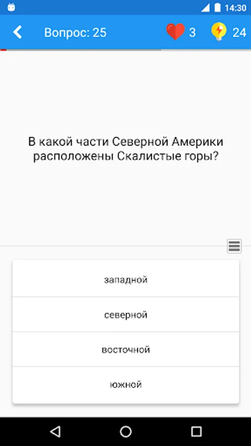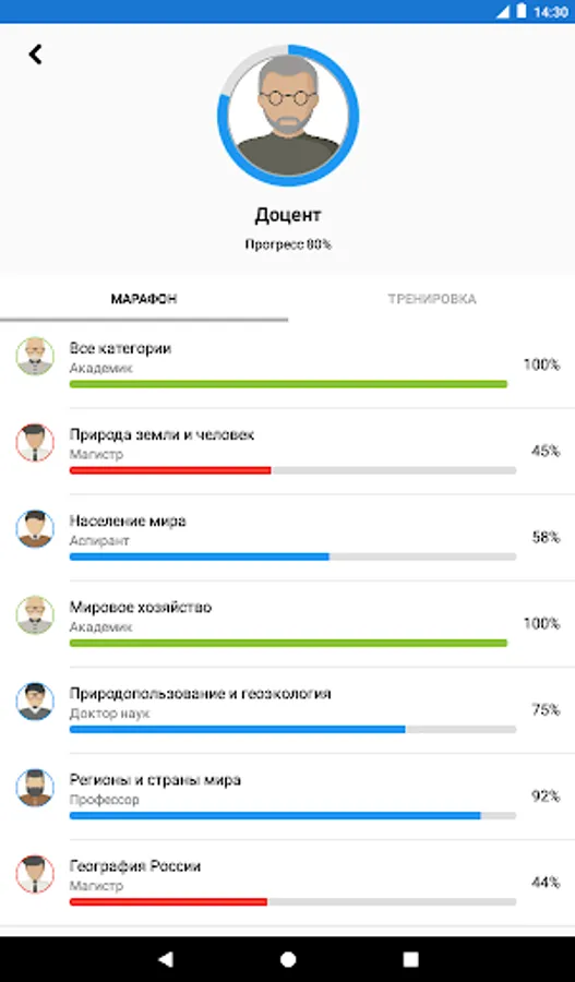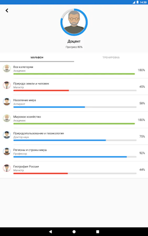 The questions are divided into difficulty levels. The basic levels cover key areas and aspects of geography, which will allow you to become a real expert in geography. The advanced level will give you the opportunity to feel like a real expert in the field of geography, as you will need a deep knowledge of the subject being studied.
