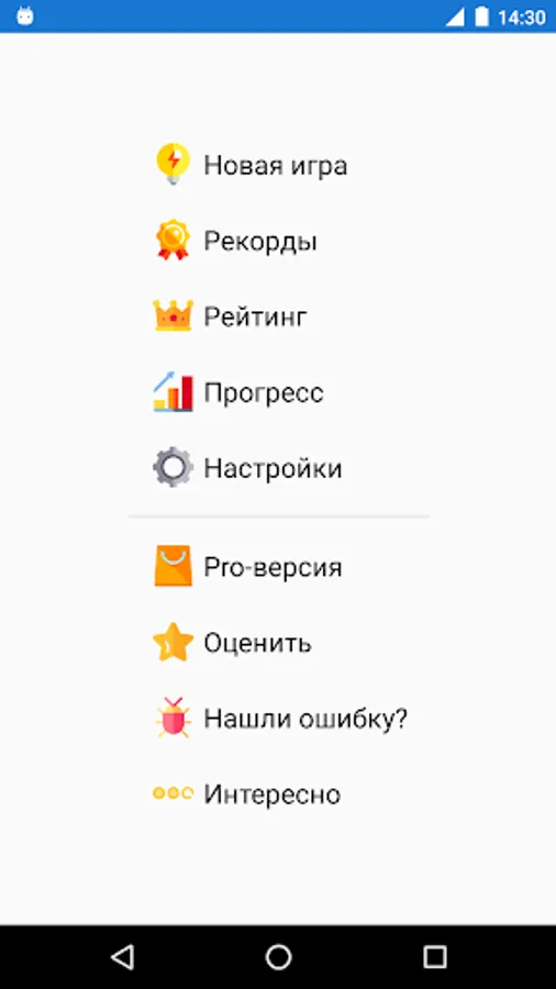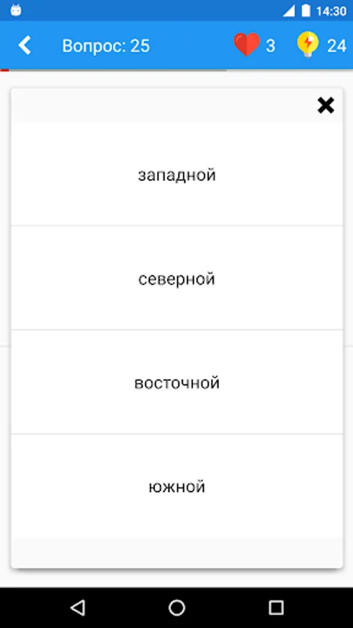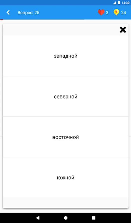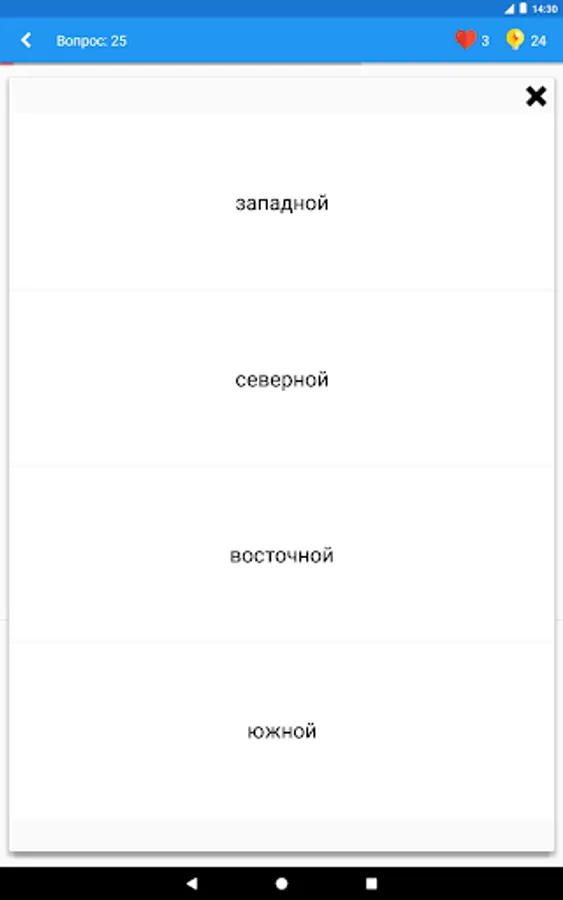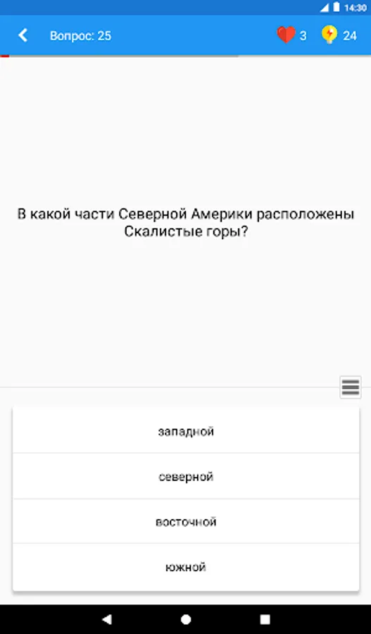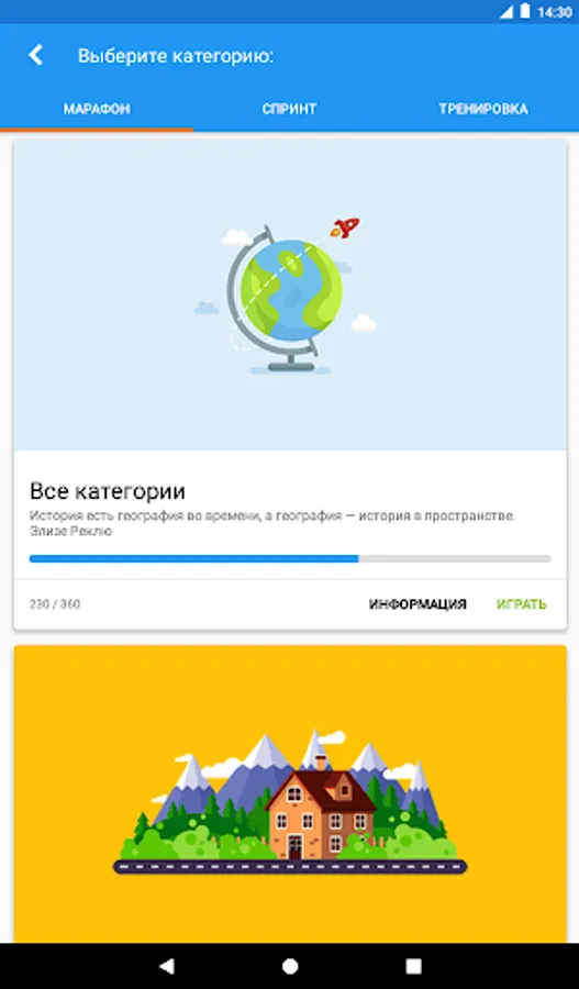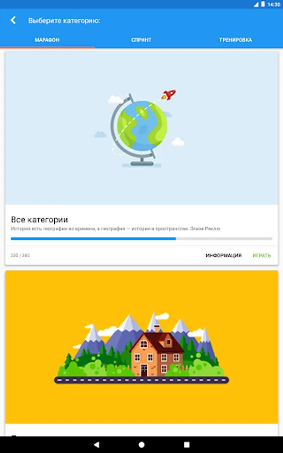 The game features three modes: arcade, marathon and sprint. In arcade mode you have to complete all levels. In marathon mode, your task is to answer all the questions of the category. Training: train tasks without lives.