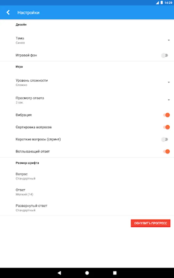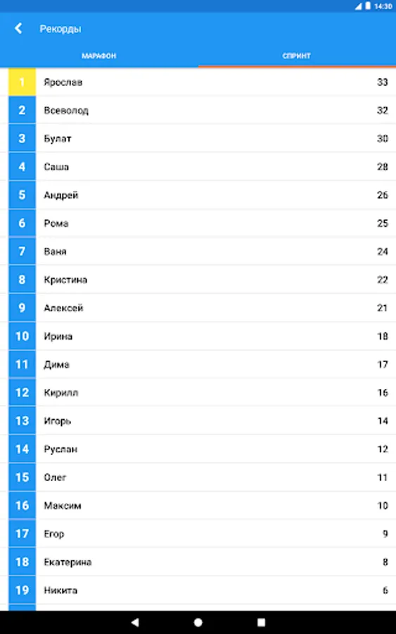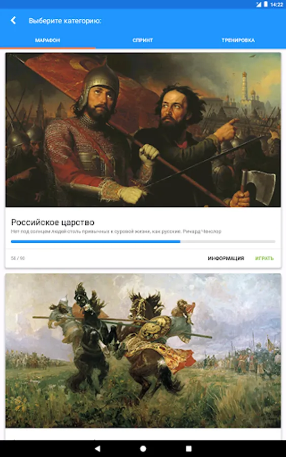 The game has two modes: marathon and sprint. In marathon mode, your task is to answer all questions of the category. Sprint: You must answer the maximum number of questions in one minute.
