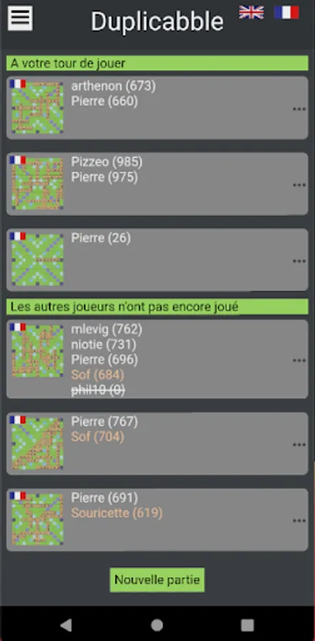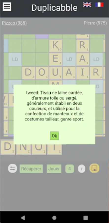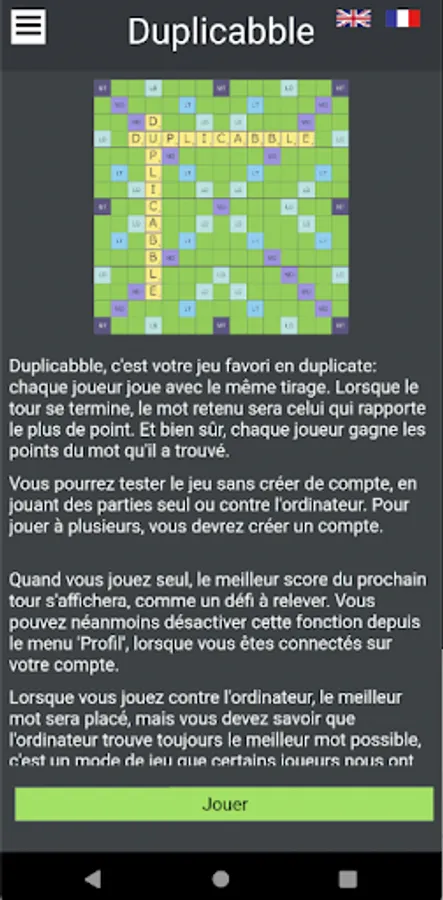By creating a new game, you can choose the language of the dictionary (English or French), the duration of the rounds (5 days or 3 minutes flat), as well as the type of draw, random simple, advanced or expert.