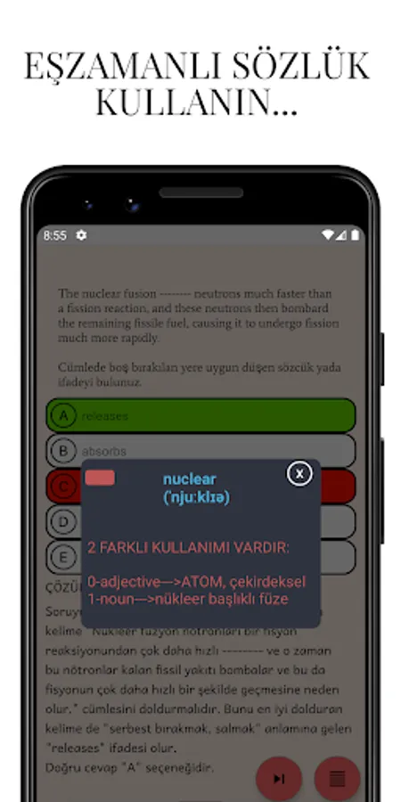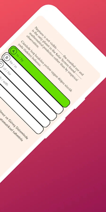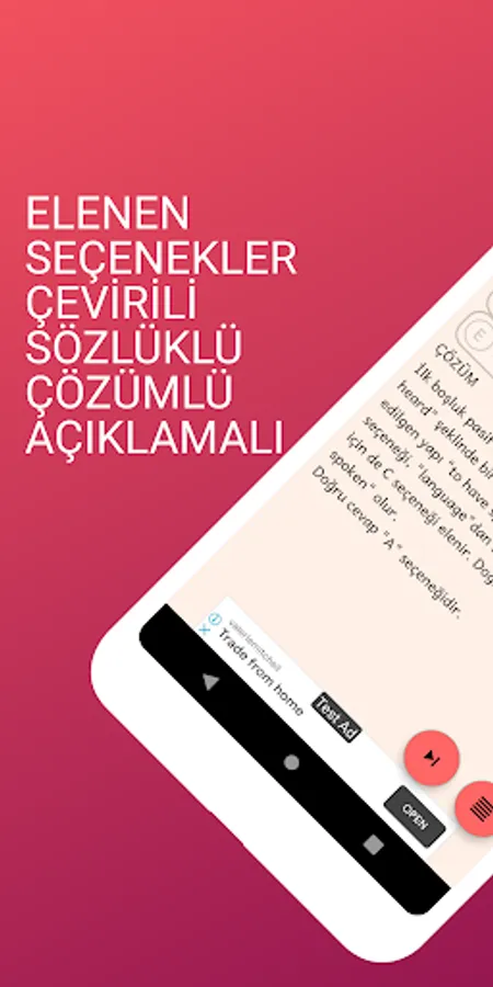 Application YDS, e-YDS etc. It is designed to fill an important gap that remains open in the market where there are many people who want to prepare for the exams. Each question provides a translation of the problem and a detailed explanation of the solution. It contains many different types of questions that can arise in all such exams, including paragraphs, words, inappropriate sentences, and dialogue. In practice, the types of questions that appear in such exams are widely included and detailed personal statistics are compiled and presented to the user according to these question types.