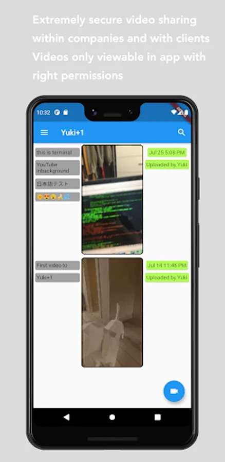 Videos can only be sent and seen within the app. It's not possible to access the videos even when the video data URL's are sniffed by hackers. Products in development and private information can remain safe.