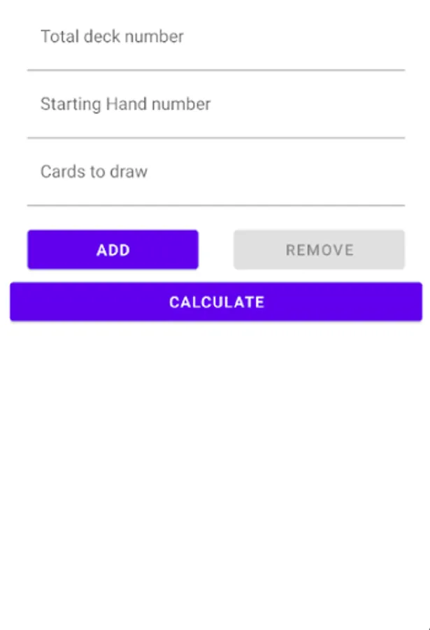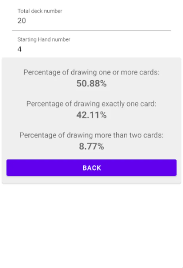 This application helps to calculate the percentage of the cars to be in the starting hand for any TCG. e.g. Yugioh, MTG