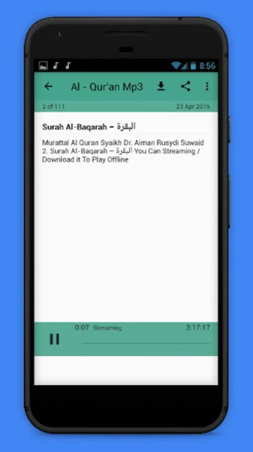 This app contains a collection of Shaykh Ayman Rusydi Suwaid Quran In Mp3 Format Which you can listen to wherever you are.