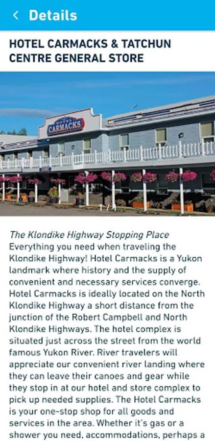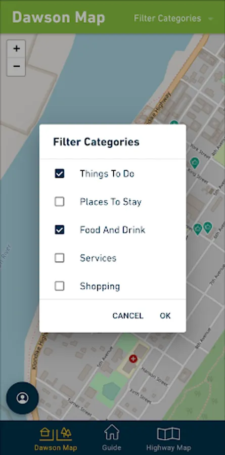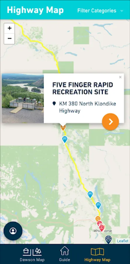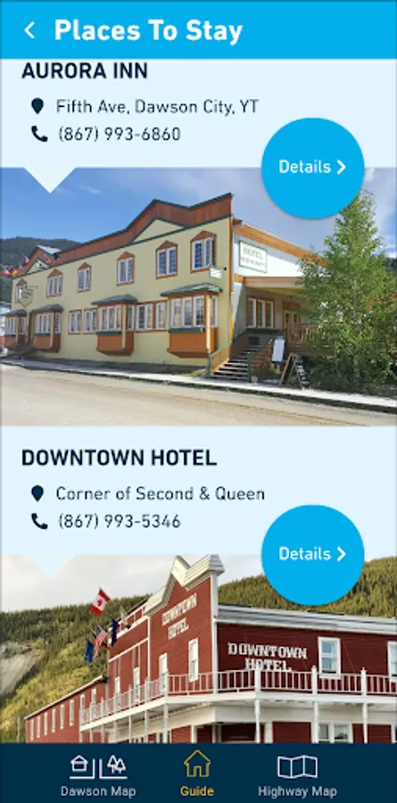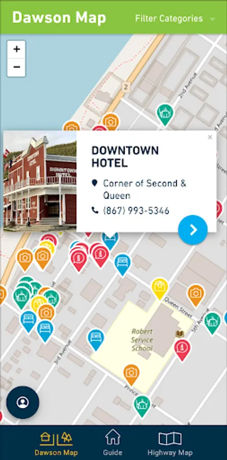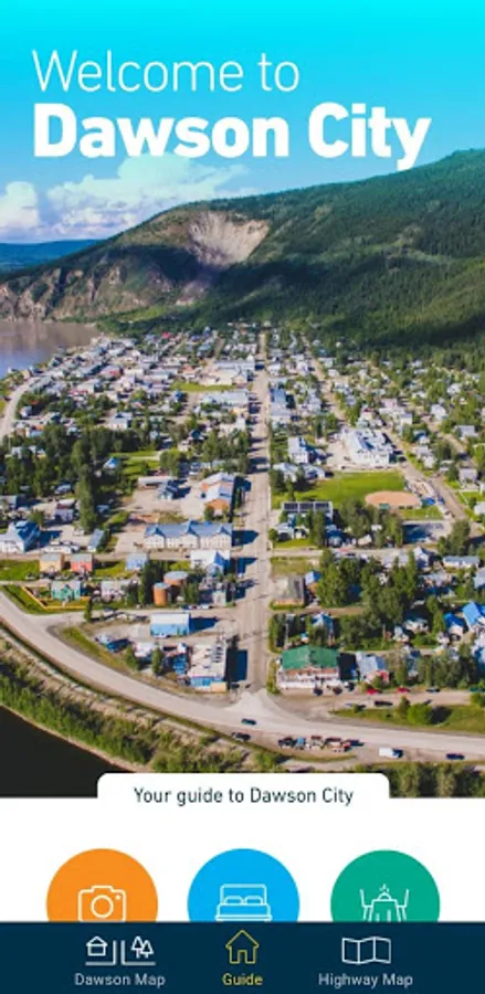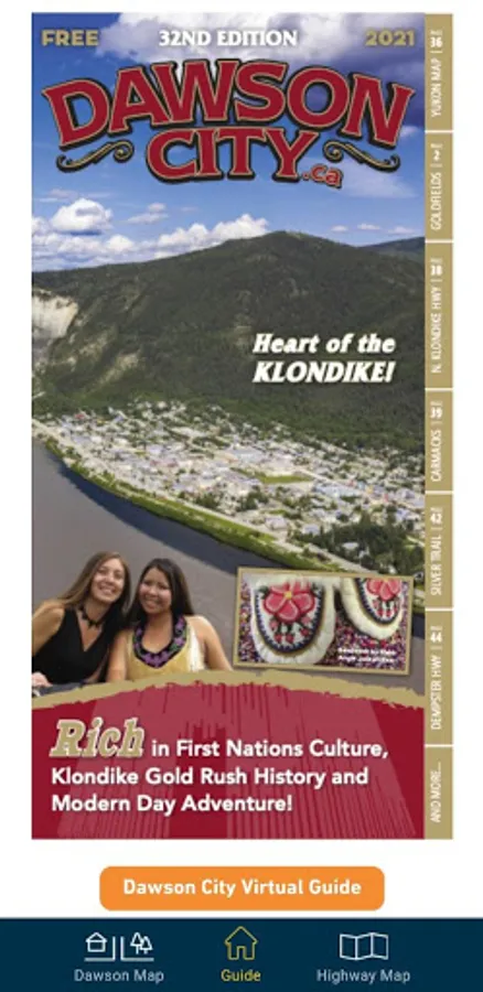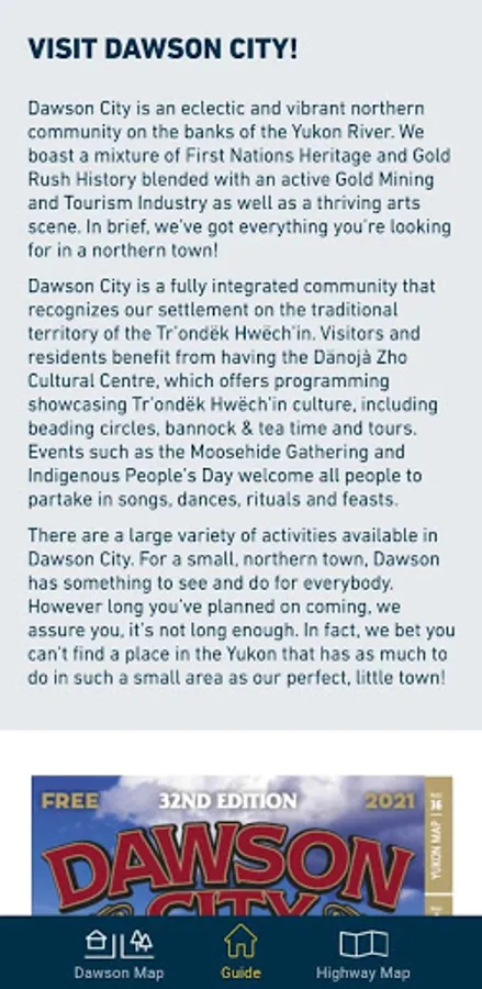 The Dawson map features business locations by category, and the North Klondike highway map includes stops and landmarks along the way.