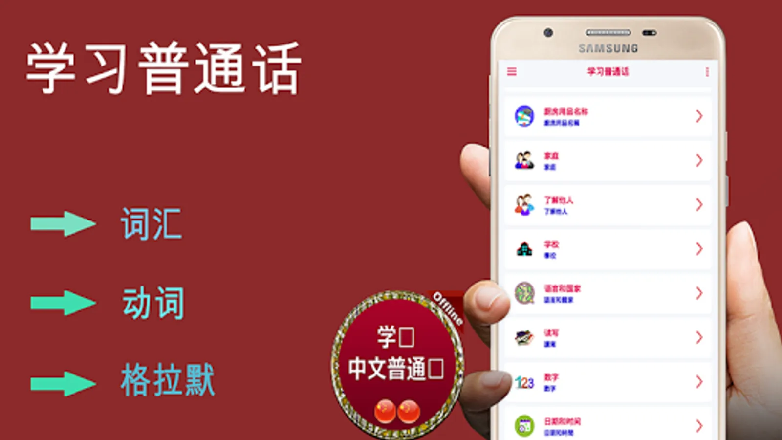 它是免費的學習應用程序,從中文到普通話,從普通話到中文。 您甚至可以在幾秒鐘內學習困難的單詞和句子。 這個程序對遊客和旅行者學習外語的基礎很有幫助。 初學者學習漢語的最佳應用程序,以及學習漢語字母表和語法的最簡便最佳方法。 它也有助於學習動詞和發音。 它在聯機和脫機模式下均有效工作。