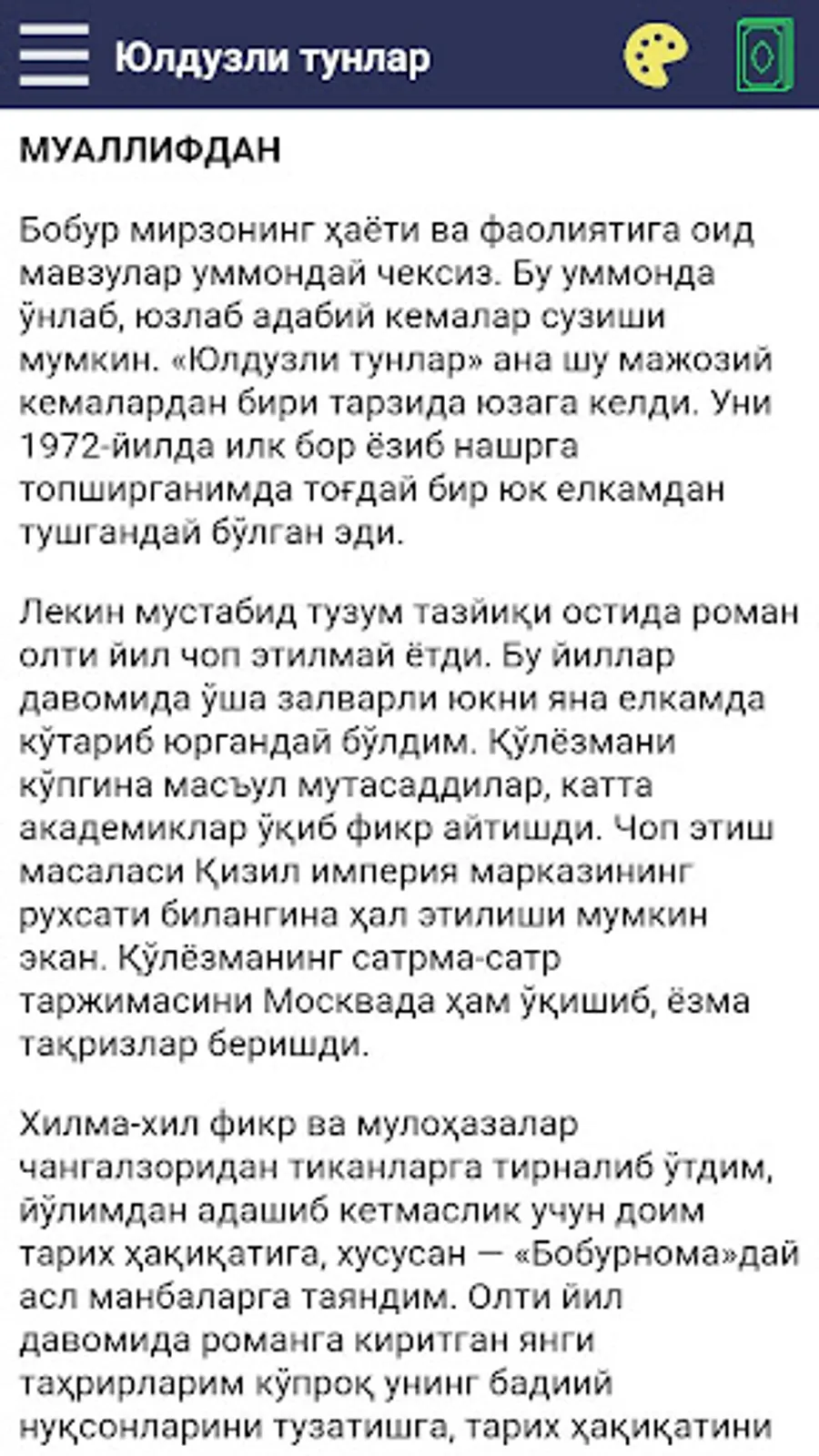 Bobur mirzoning hayoti va faoliyatiga oid mavzular ummonday cheksiz. Bu ummonda o‘nlab, yuzlab adabiy kemalar suzishi mumkin. «Yulduzli tunlar» ana shu majoziy kemalardan biri tarzida yuzaga keldi. Uni 1972-yilda ilk bor yozib nashrga topshirganimda tog‘day bir yuk yelkamdan tushganday bo‘lgan edi.