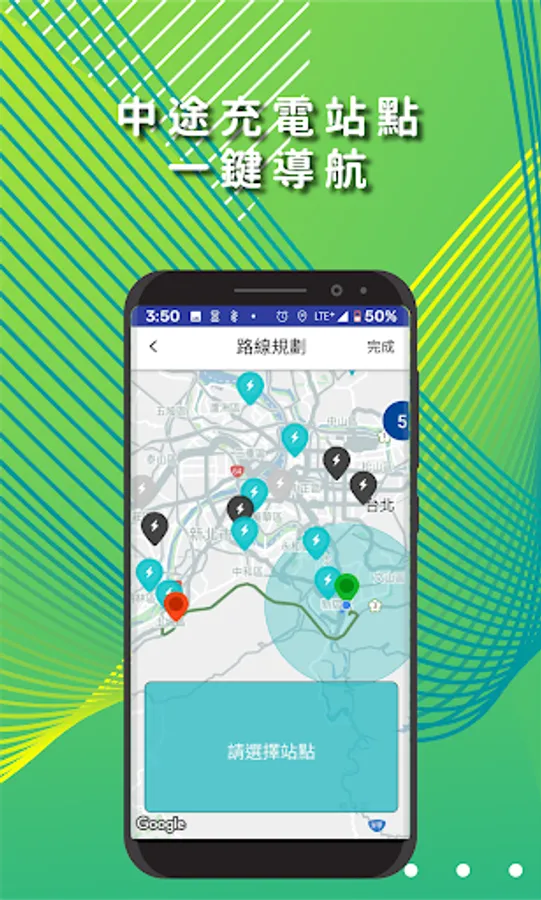 選好目的地,設定充電里程數,接下來讓本功能提醒您在範圍內設定停靠充電站!再將規劃好的路線輸出到Google map,然後出發吧!