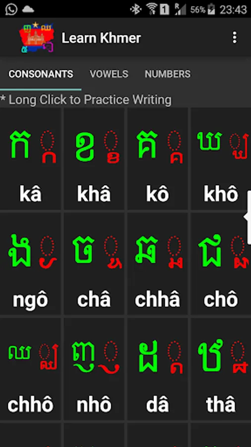 Learn Khmer Alphabet App is intended to help you learn the Khmer Alphabet quickly and easily using visual and Audio combined for quick learning and also Writing practice.