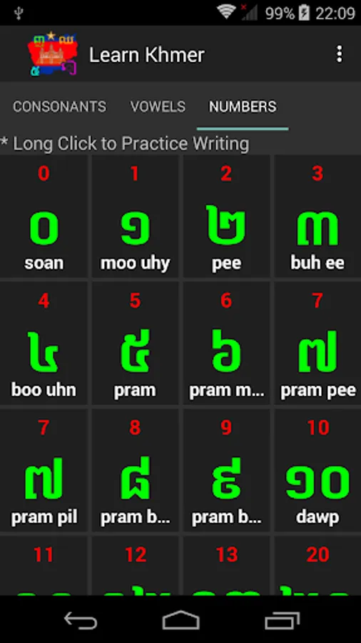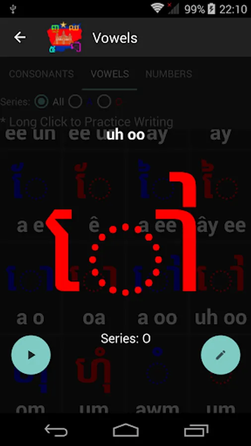 Learn the Vowels of the Khmer language, with pronunciation sounds in both Series A and Series O and Independent Vowels, Read, Write and understand the numbering system in Khmer language and practice it until you feel secure. - New addition is the Quiz Mode for great practice.