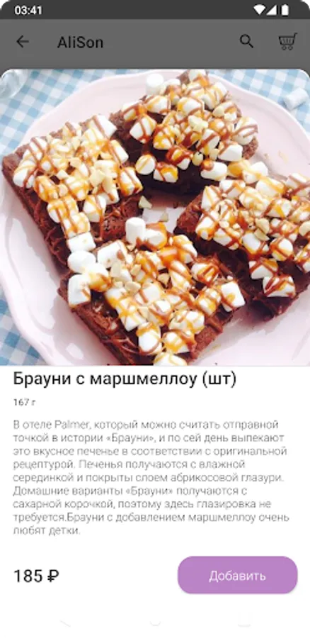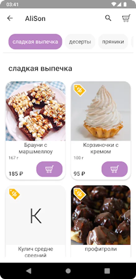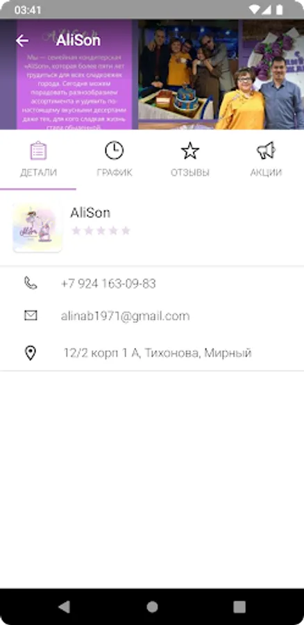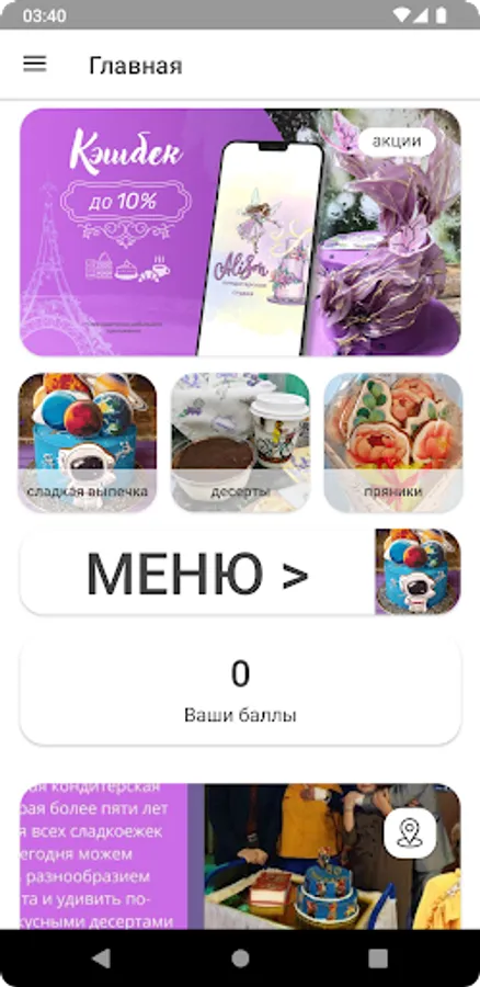 Также, помимо разнообразных десертов, тортов, выпечки и пряников, сделанных из высококачественных продуктов, вас ожидает информация об акциях, розыгрышах и промокодах. Приятным бонусом для всех пользователей мобильного приложения станет КЭШБЭК до 10% на продукцию семейной кондитерской «AliSon».