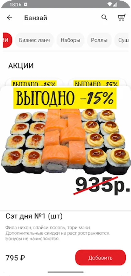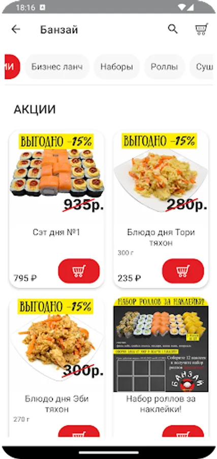 Сервис дает возможность оплачивать заказы баллами и сохранять историю заказов. В дополнение к бонусам у нас действуют различные акции и скидки (скидка на меню 15% с 10.00 до 16.00, скидка 15% на день рождение) Больше акций и скидок Вы можете найти в нашем приложении “БАНЗАЙ”