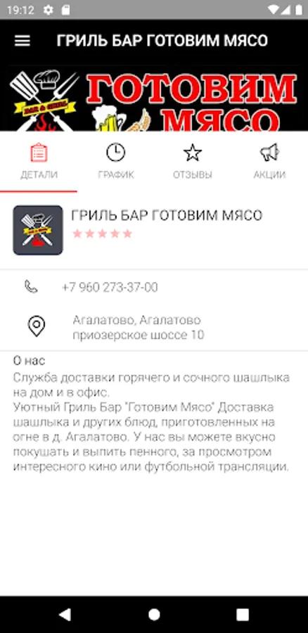 Уютный Гриль Бар "Готовим Мясо" Доставка шашлыка и других блюд, приготовленных на огне в д. Агалатово. У нас вы можете вкусно покушать и выпить пенного, за просмотром интересного кино или футбольной трансляции. У нас Вы можете выбрать и заказать вкуснейший, свежий Шашлык, Люля кебаб, Гриль ролл (шаурма на мангале), Бургеры с сочной котлетой, приготовленной "из-под ножа" на живом огне, по приятным ценам! Наш секрет успеха: только профессионалы-повара, только натуральные специи и овощи, только настоящее не замороженное мясо. Доставка от д. Агалатово-д.Керро от 500р. рублей БЕСПЛАТНО!!!(Отдаленные районы сумма заказа обговаривается)
