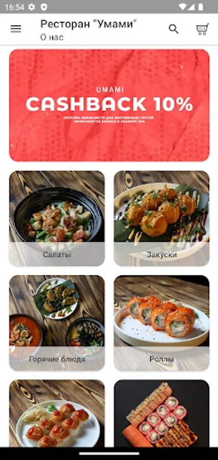 Приложение дает возможность накапливать кэшбэк, списывать его, сохраняет историю заказа.