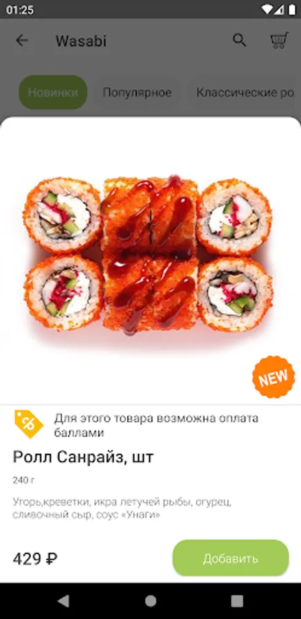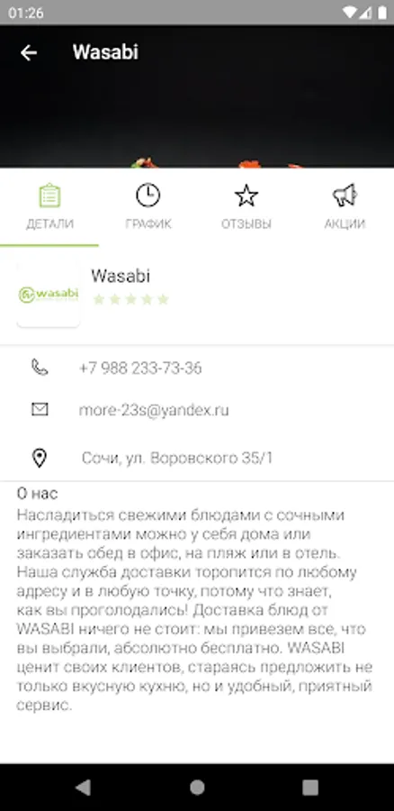 Приложение Wasabi— это удобный способ заказа еды домой или в офис! Мы готовим наши блюда из качественных свежих ингредиентов и доставляем еду по Сочи быстро и бережно. Выбирайте и заказывайте вкусную еду с доставкой всего в несколько кликов! В нашем меню всегда можно найти изысканную итальянскую пиццу, сытные бургеры по уникальной рецептуре. Для любителей японской кухни – нежные суши и роллы, интересные аппетитные горячие блюда, разнообразные салаты. Оцените всё удобство функционала: интуитивно понятное и разнообразное меню, удобная корзина и быстрое оформление заказа, выбор способа оплаты, личный кабинет с историей заказов, уведомления о статусе заказа. Скачивайте наше приложение, оформляйте заказ и наслаждайтесь любимой едой, где бы Вы ни были! Приятного аппетита