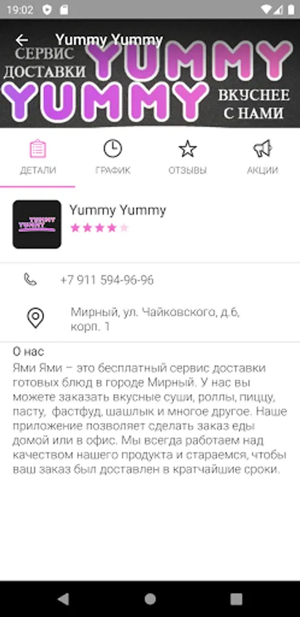 Ями Ями – это бесплатный сервис доставки готовых блюд в городе Мирный. У нас вы можете заказать вкусные суши, роллы, пиццу, пасту, фастфуд, шашлык и многое другое. Наше приложение позволяет сделать заказ еды домой или в офис. Мы всегда работаем над качеством нашего продукта и стараемся, чтобы ваш заказ был доставлен в кратчайшие сроки.