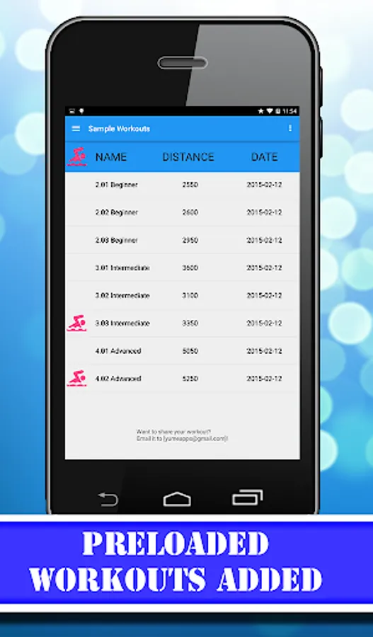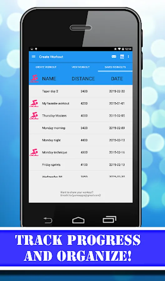 *Organize saved workouts by name, distance, or date by clicking name, distance, or date!