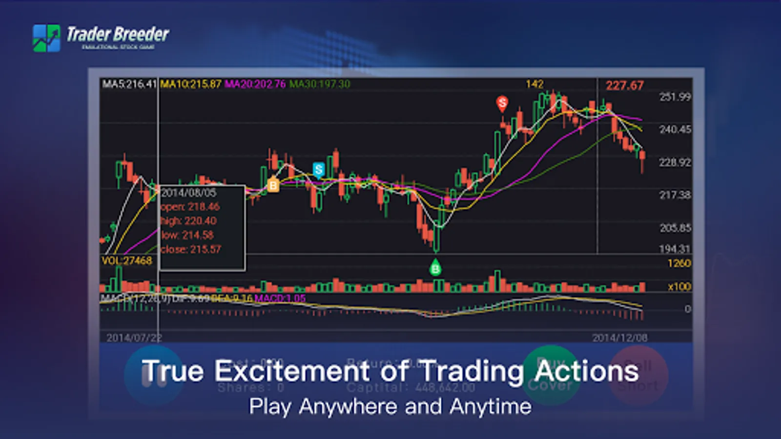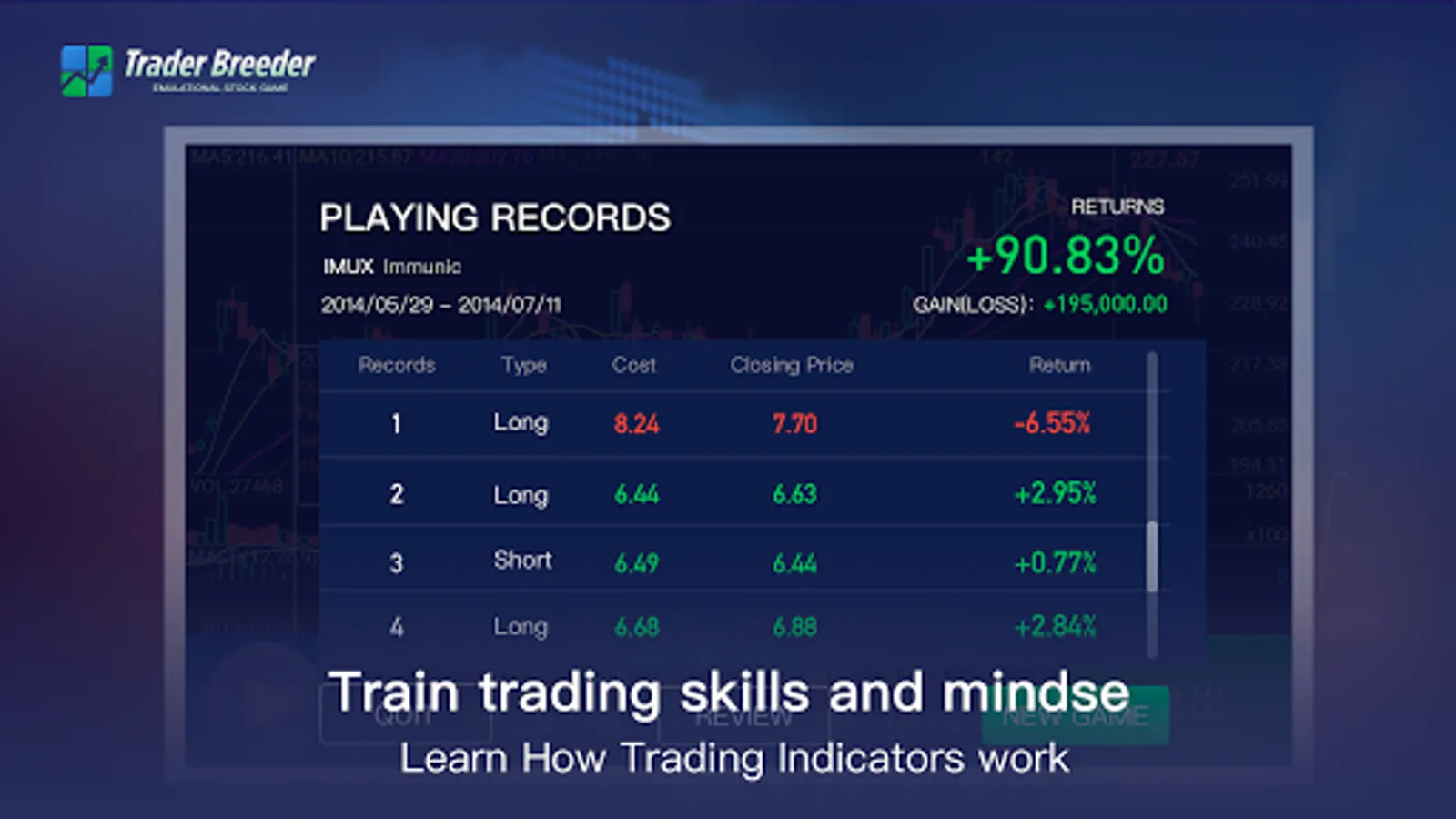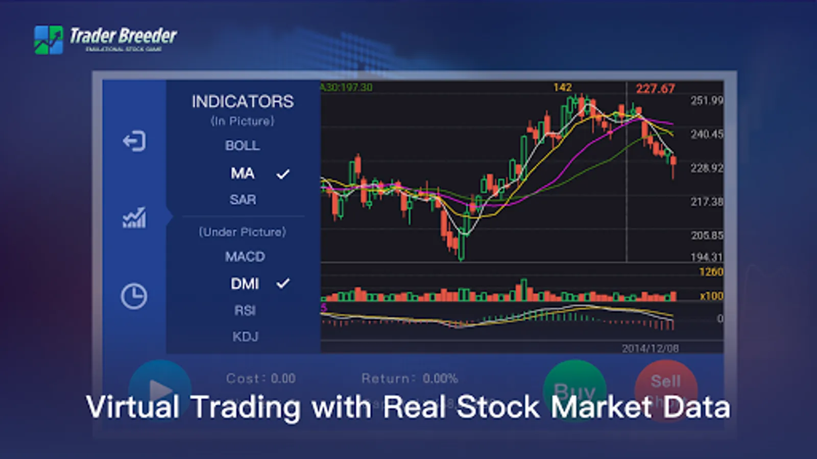 Trader Breeder is a virtual stock market trading game developed for Android platform. It is the first game that allows players to trade stocks continuously within a short span of time. The game uses real historical data, which enable players to experience the excitement of the stock market. The game also incorporates many basic trading indicators, and explores these basics and the generation of their buy/sell signals in a dynamic way, so that players can improve their knowledge and hone their trading skills while playing the game.Learning these indicators will enhance a players' trading techniques and prepare them psychologically for the real stock market.