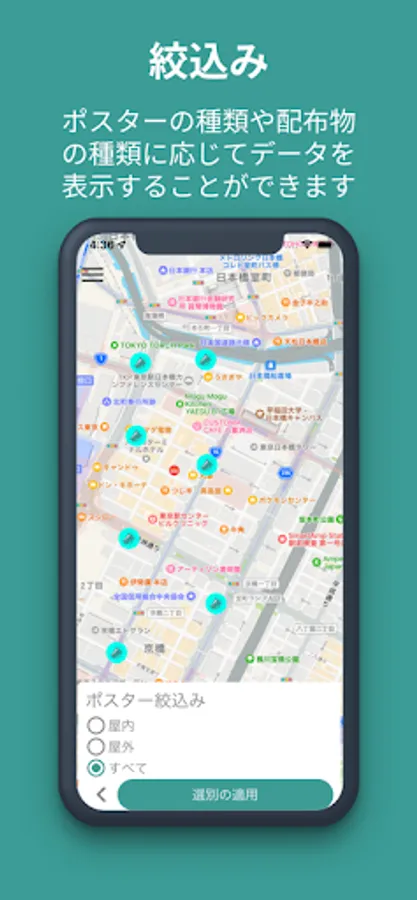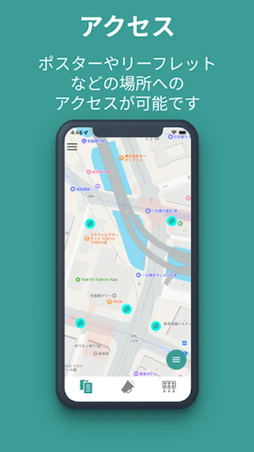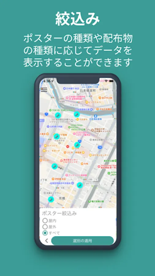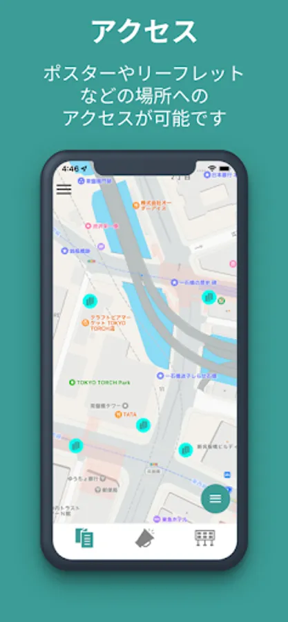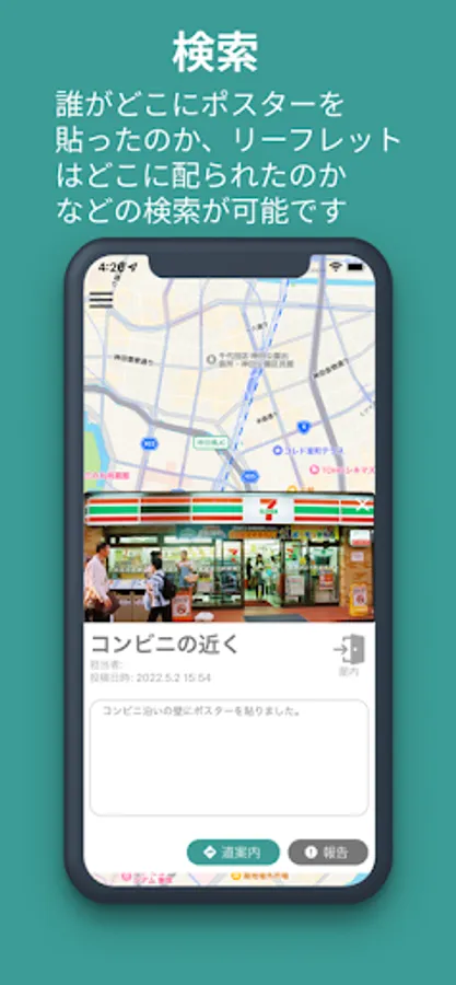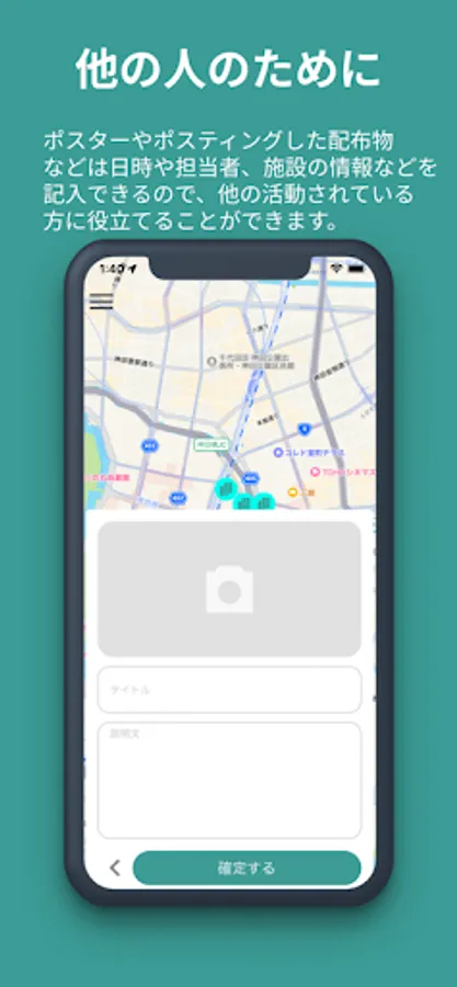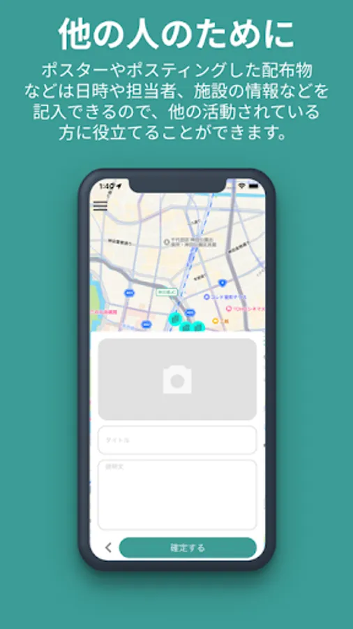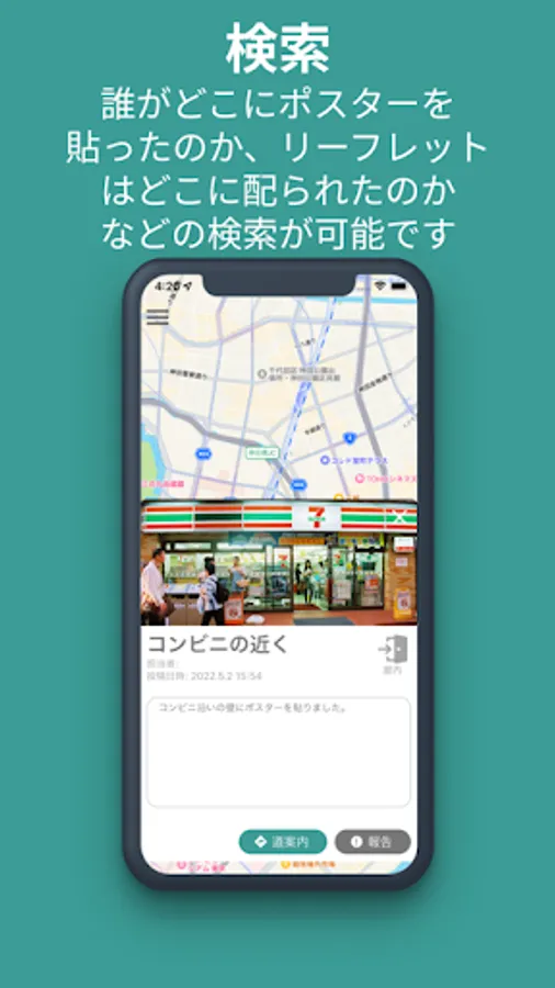 The "Smartphone de Map" app is an app with location information registration and navigation functions that was developed to be convenient for poster posting and posting, which are indispensable for election campaigns and promotions.