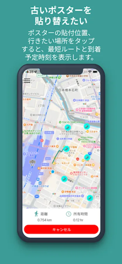 If you press the poster sticking position or the icon on the voting bulletin board and press the "Directions" button, the shortest route and estimated time of arrival will be displayed. Along this line, you can take the shortest route to places where posters have already been posted or voting bulletin boards. It is very convenient because you can update the date and time when you distribute the leaflet to the same place again!