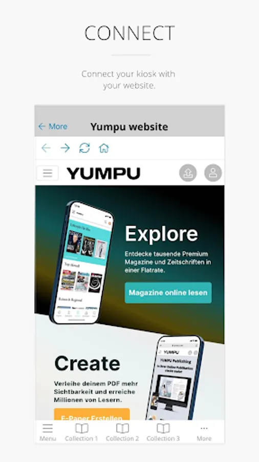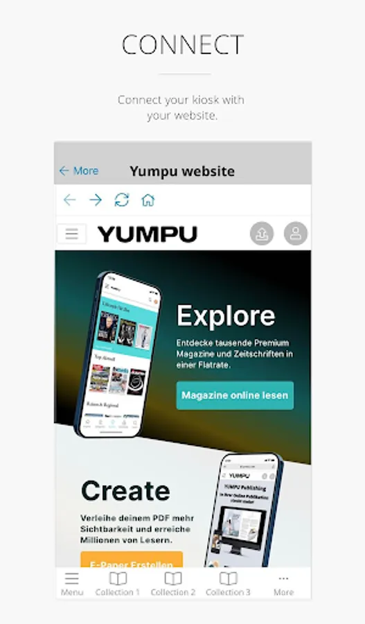 The future of digital magazine publishing is here: The Yumpu – Digital Publishing App is an all-in-one digital publishing solution that lets you present all your magazines combined in a single kiosk app.