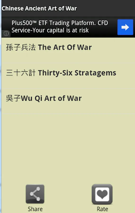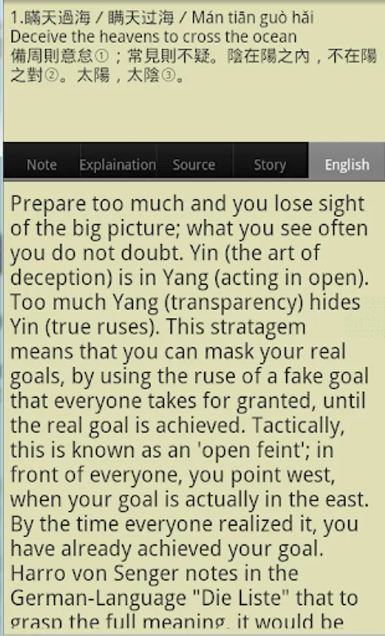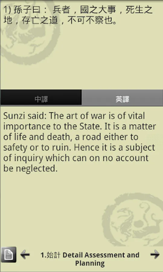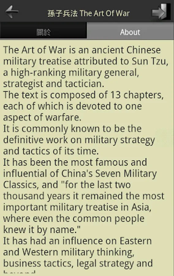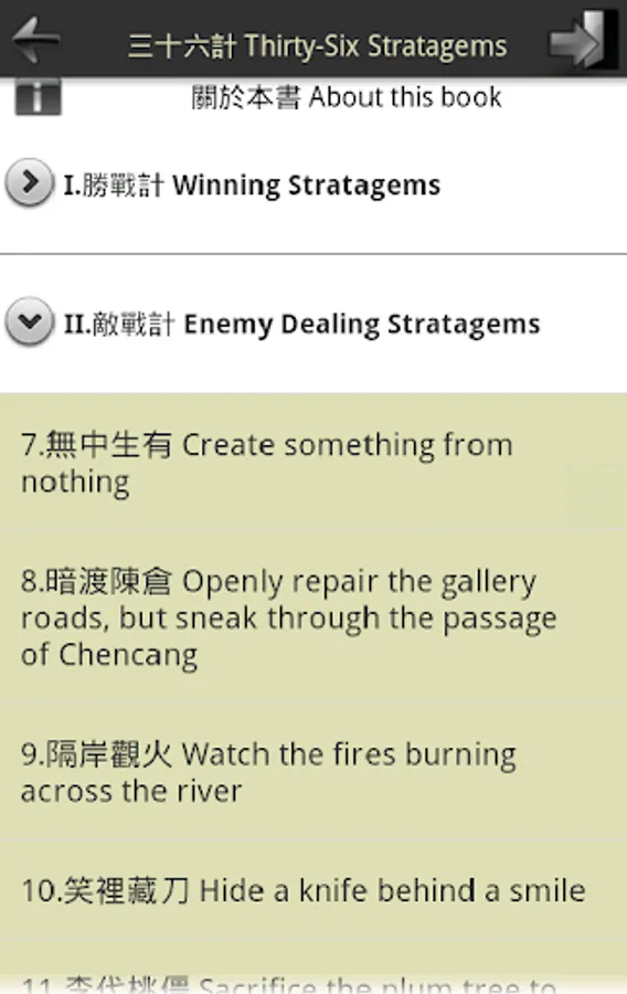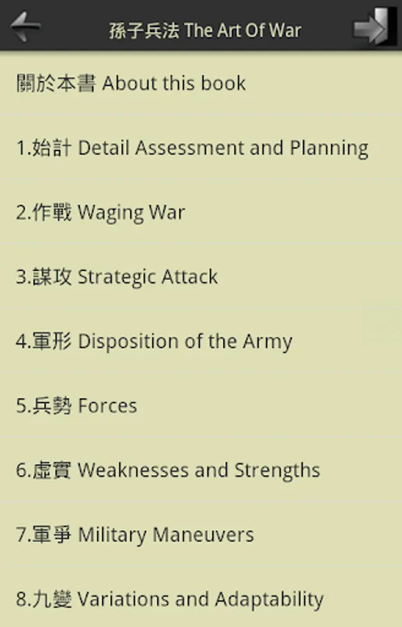 This software include three Chinese ancient books about the art of war, The Art of War, Thirty-Six Stratagems And Wu Qi Art of War.