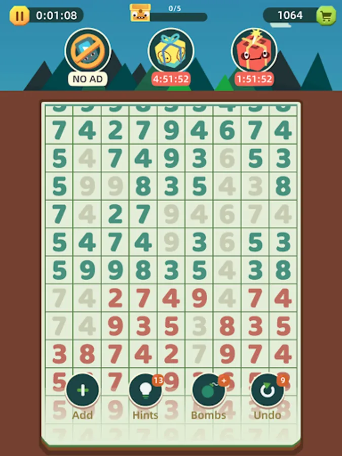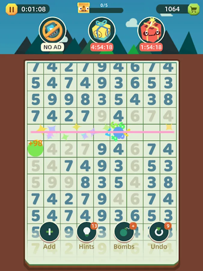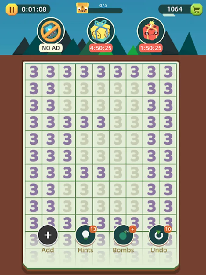 When there is no matching number on the board, the props at the bottom of the screen can provide you with a helping hand! Players can choose to copy the remaining numbers on the board and add them to the game. Or use Bomb, Swap, Hint or Undo to change the situation!