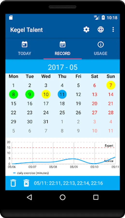 * Days with Kegel exercises will be indicated by color. Green >= 3 exercises; Yellow < 3 exercises; Red = Today's record.